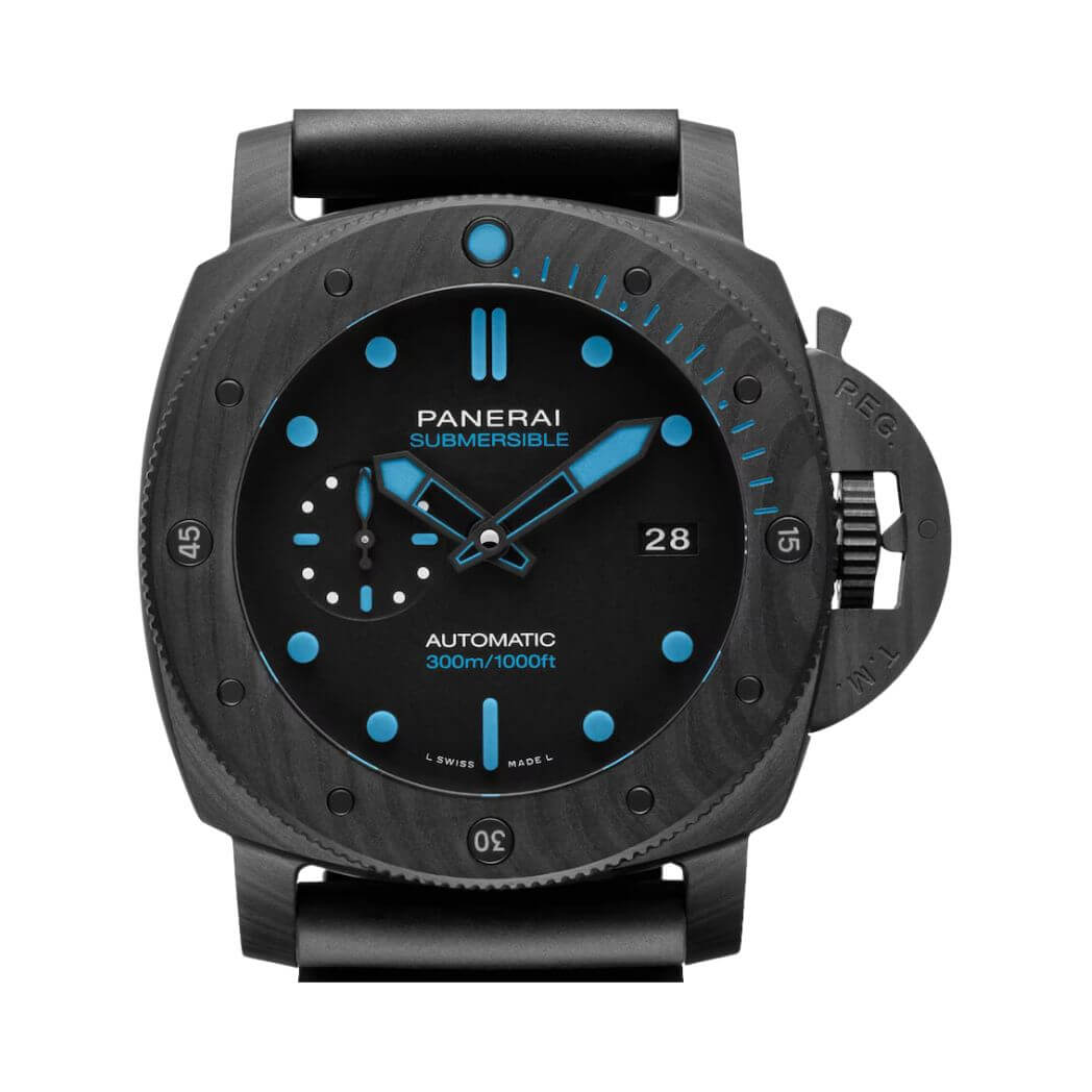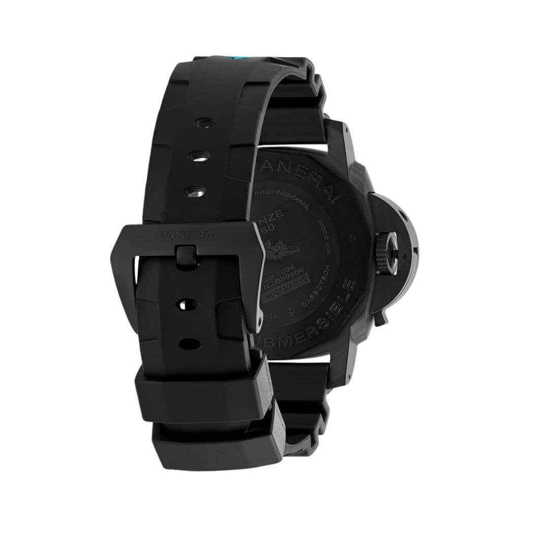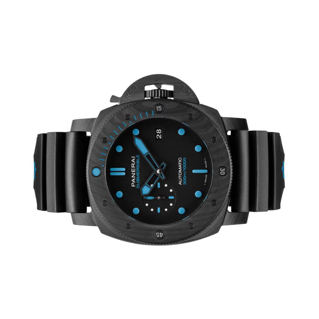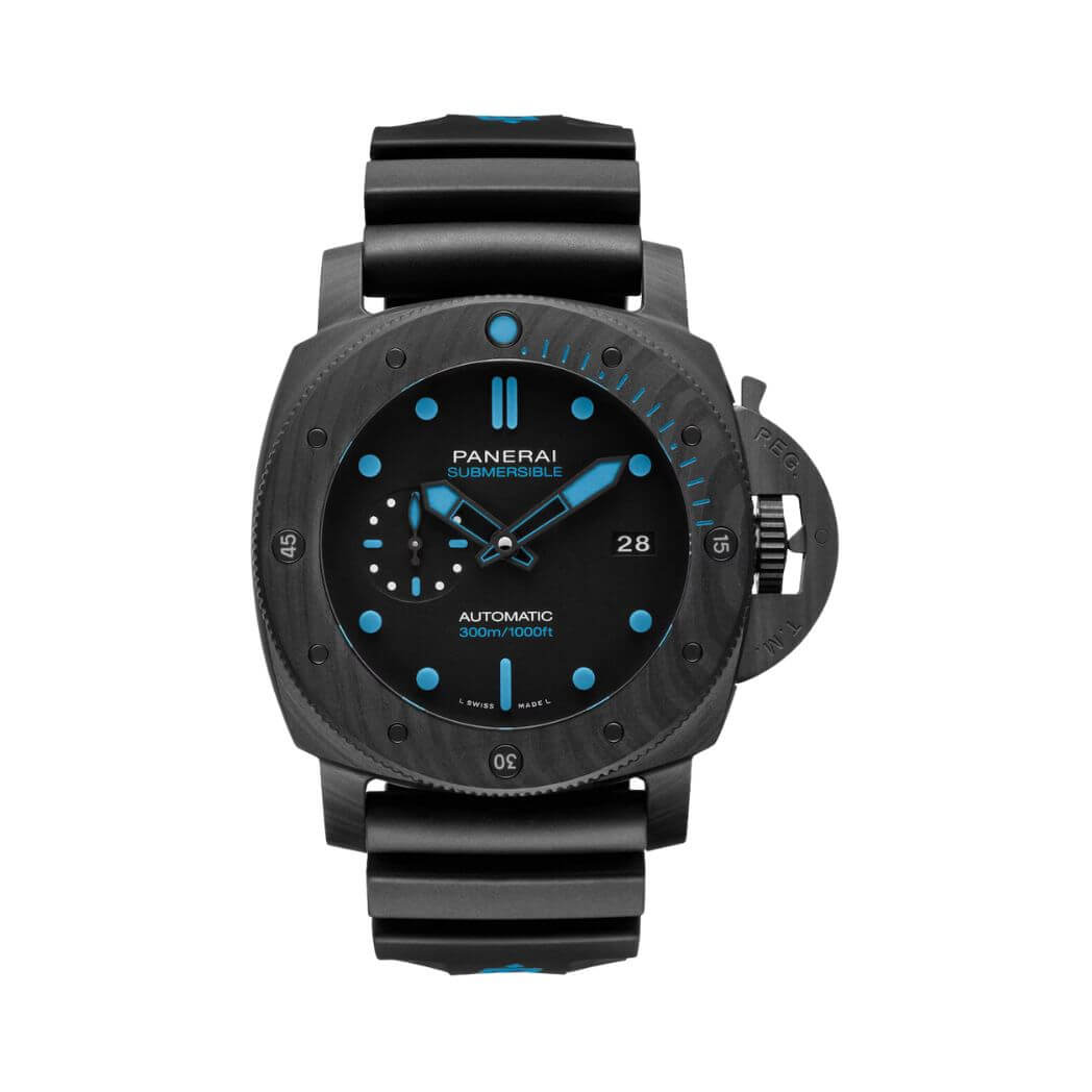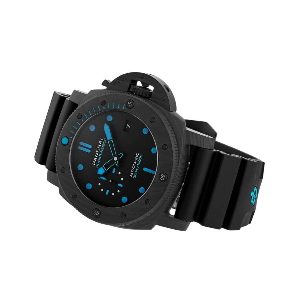 47mm carbotech case, solid case back, automatic movement, power reserve 3 days, black dial, screw down crown, tang clasp, black rubber strap, water resistant to 300m/1000ft.