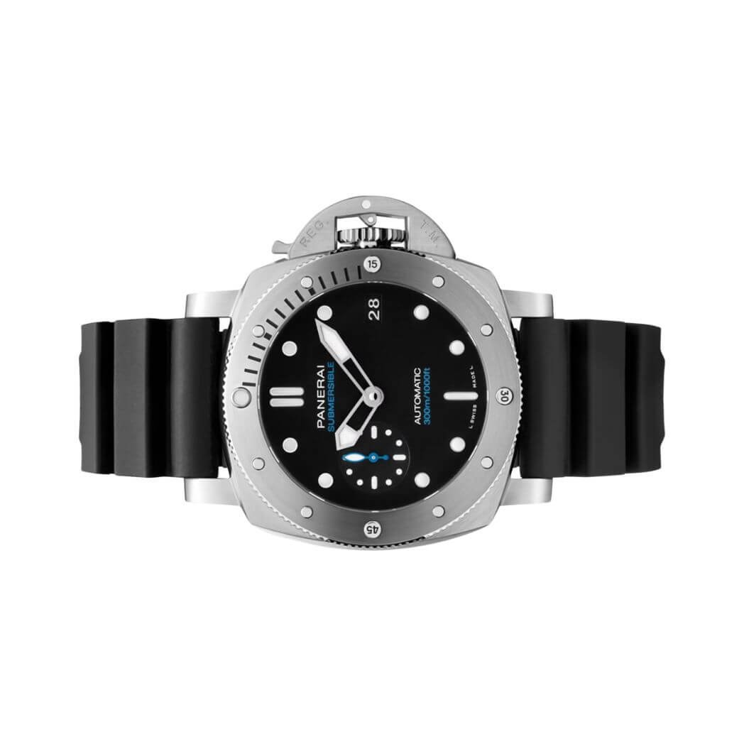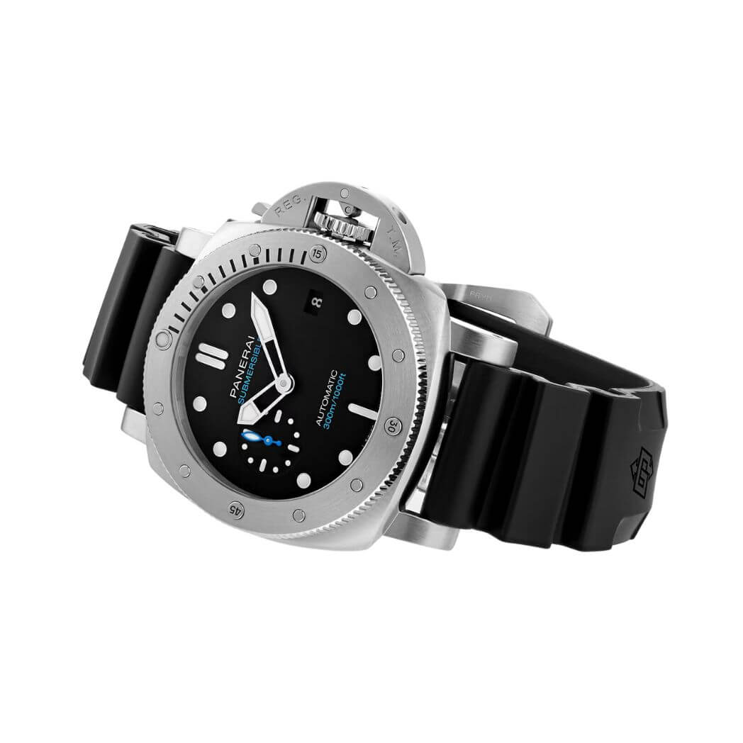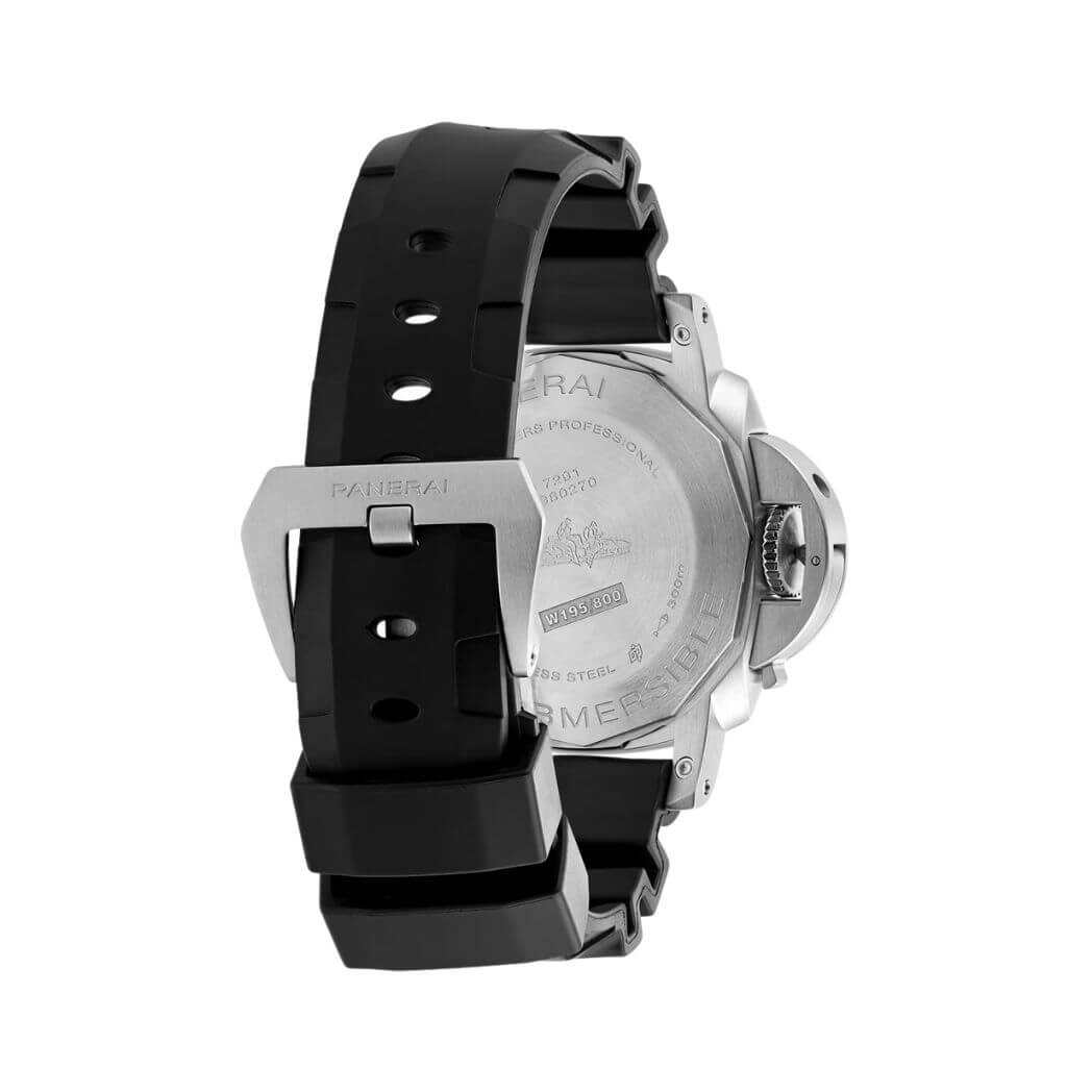 Panerai Luminor Submersible PAM00973 features self-winding automatic watch, features a 42mm stainless steel case surrounding a black dial on a black rubber strap with a stainless steel tang buckle. Functions include hours, minutes, small seconds and date.