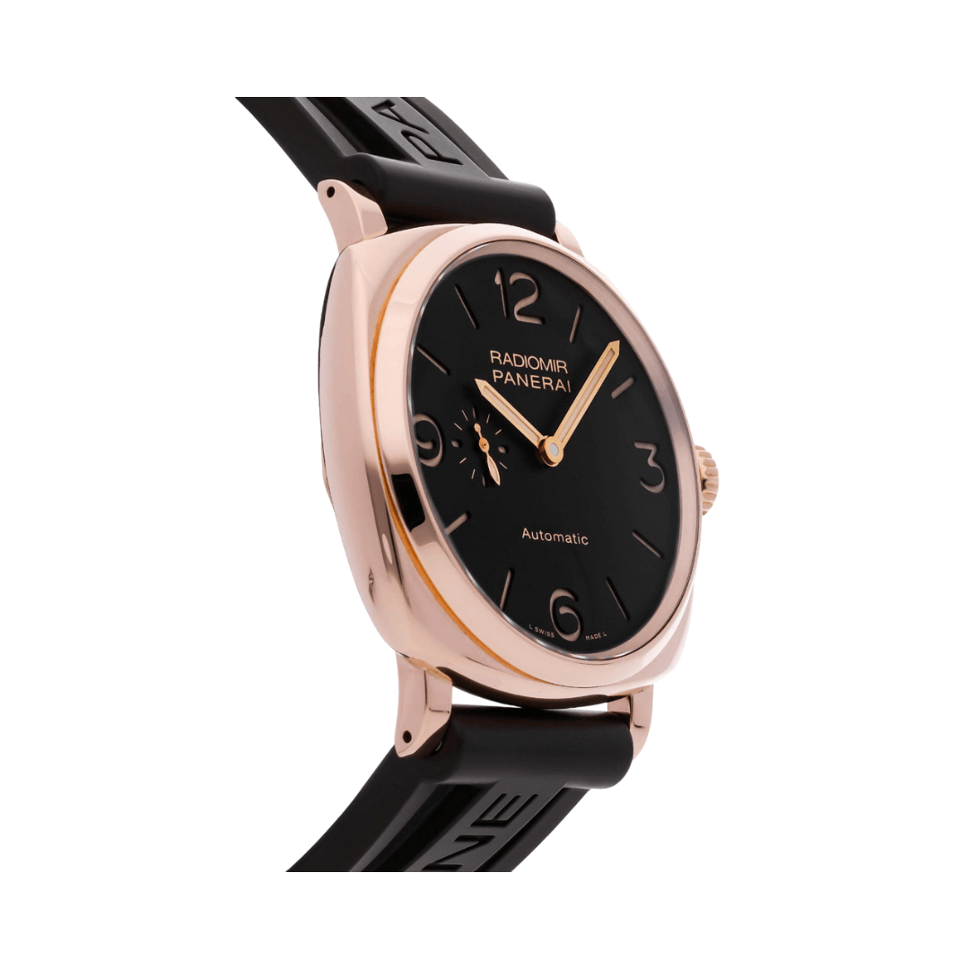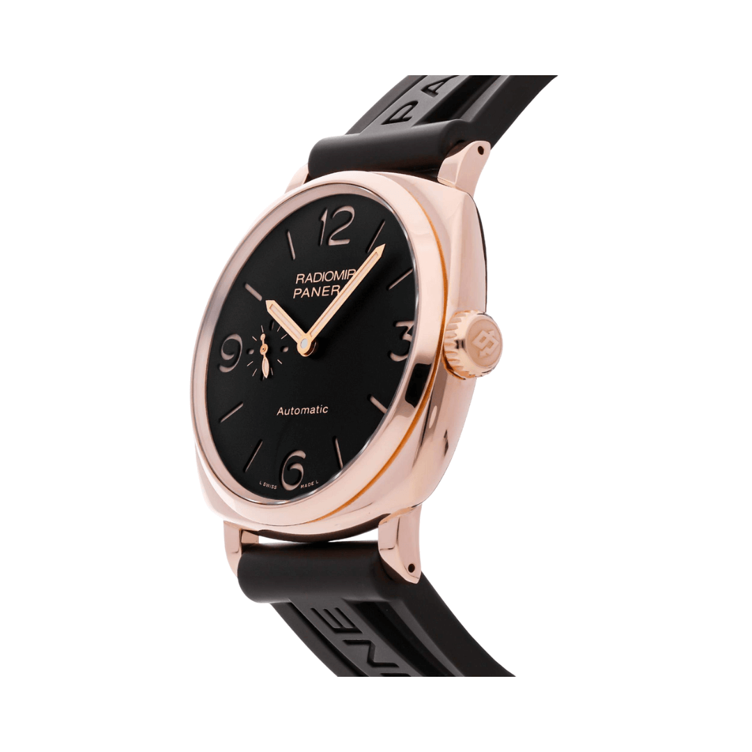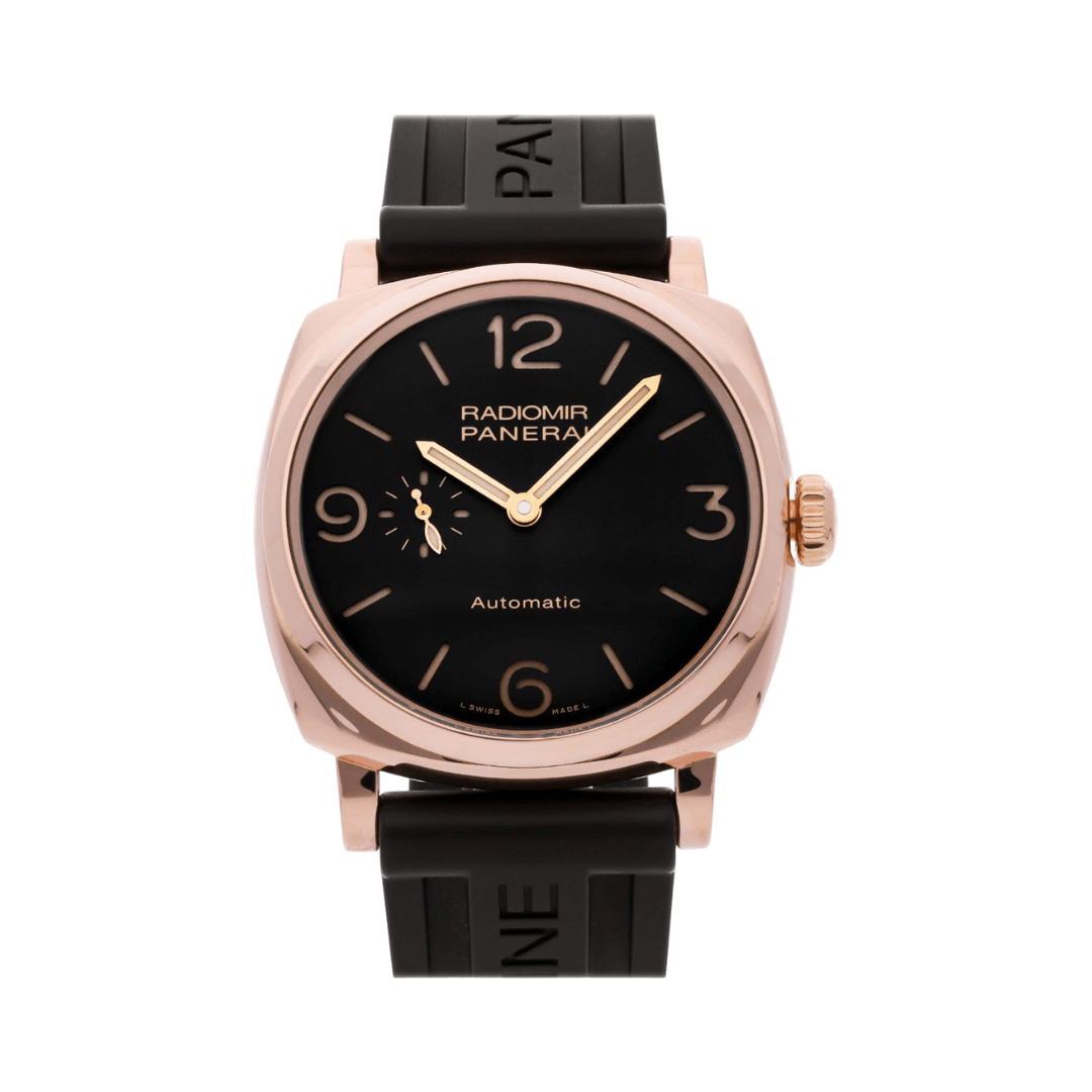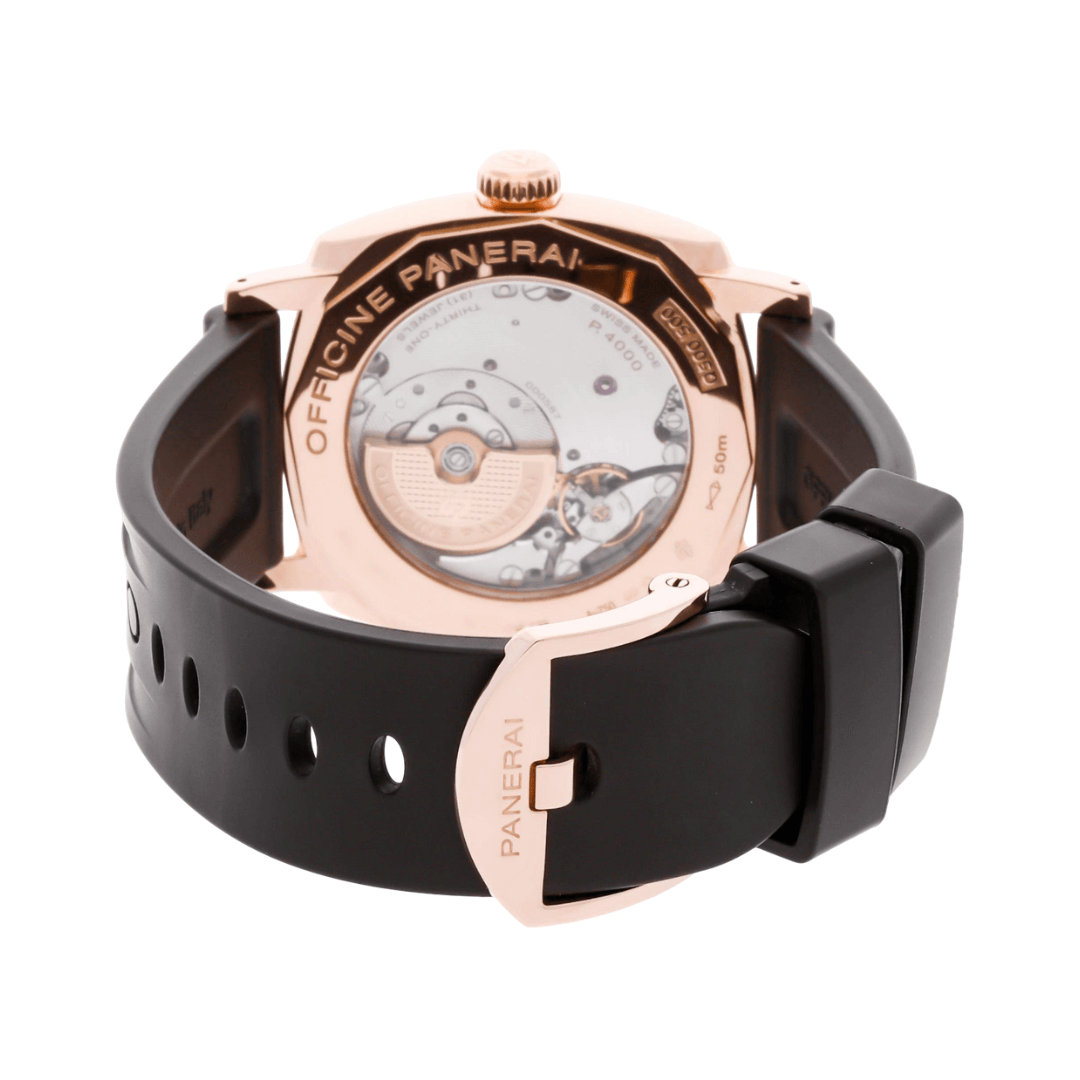 The Panerai Radiomir PAM00573 is a luxury men’s watch with a modern yet timeless look. It features a strong 45mm case made from 18k rose gold, giving the watch a rich and elegant feel. The design is clean and classy, perfect for formal occasions or everyday style.