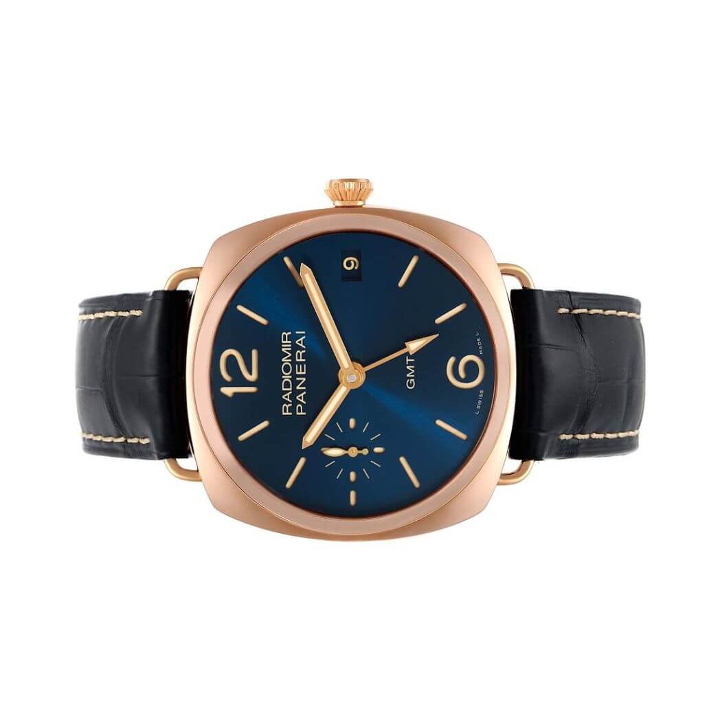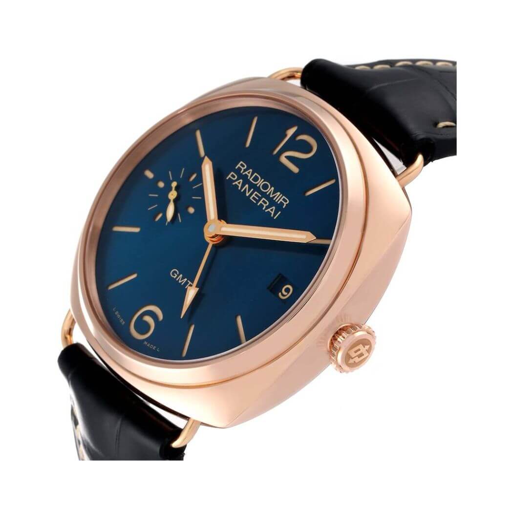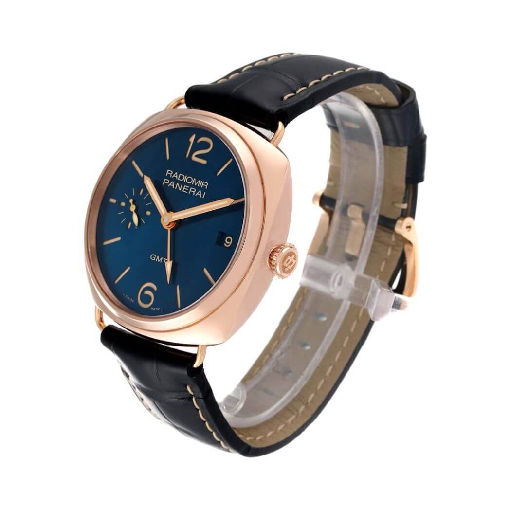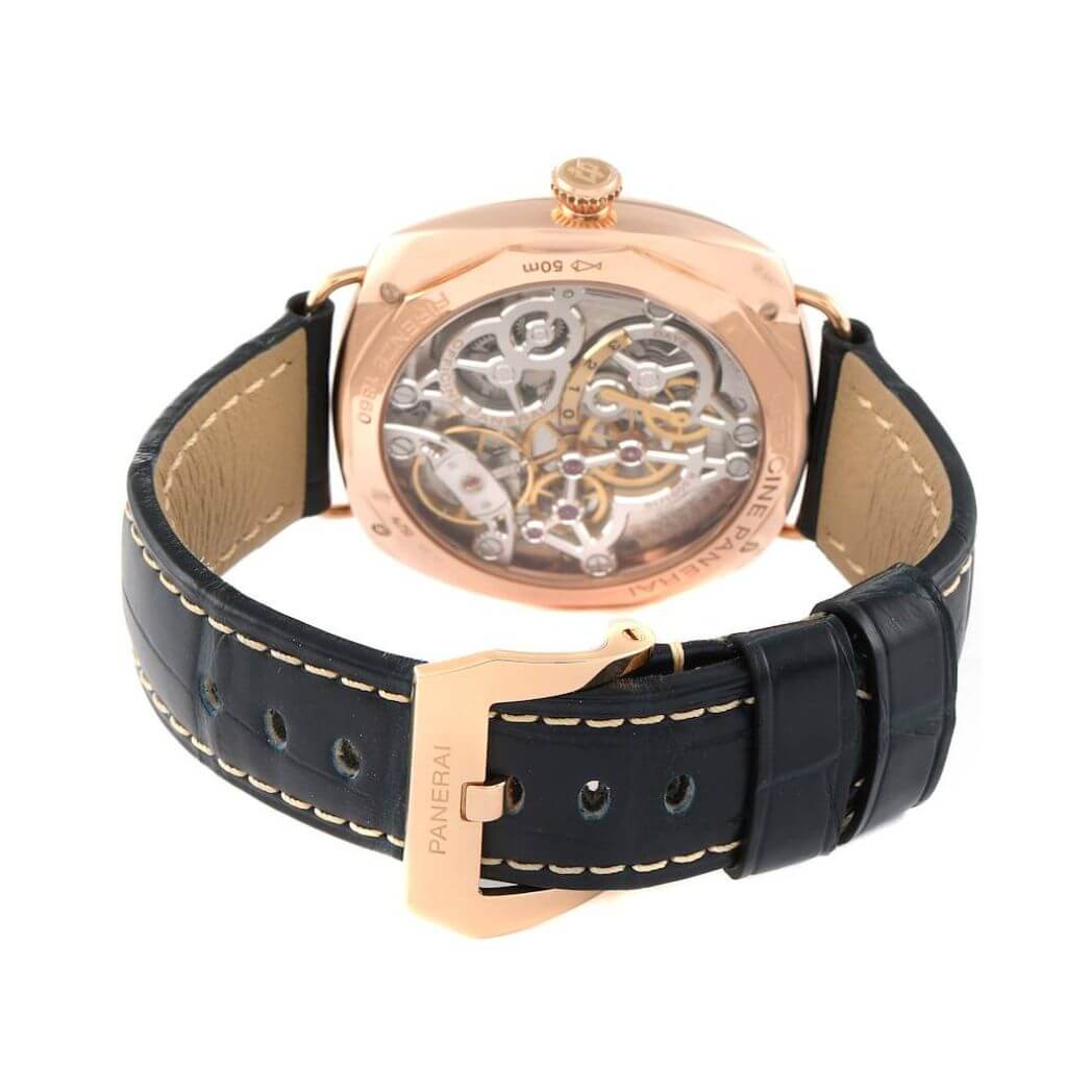 47mm 18kt rose gold case, blue dial, dark blue leather strap, Hand-wound mechanical movement, P.3001/10 calibre, executed entirely by Panerai, 16 lignes, 6.3 mm thick, 21 jewels, Glucydur balance, 21,600 alternations/hour, Incabloc anti-shock device, Power reserve 3 days, two barrels, 207 components, scratch resistant sapphire crystal, tang buckle clasp, fixed bezel, water resistant to 50m/165ft.