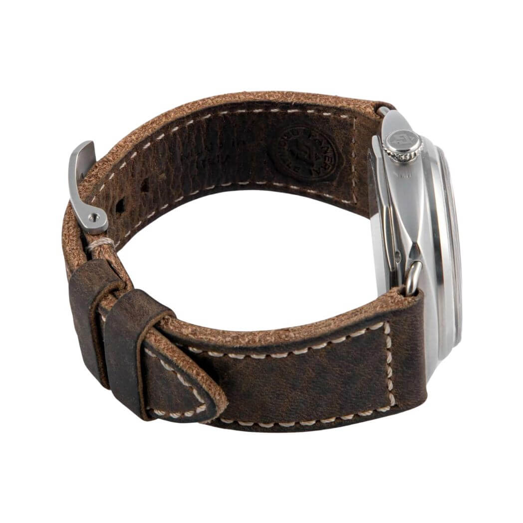 The watch features a robust case made of patina steel, lending it a distinctive and vintage appeal. Its round shape and 45mm diameter make a bold statement on the wrist. The brown leather strap complements the case, adding a touch of sophistication. The scratch-resistant sapphire crystal ensures durability and clear visibility.