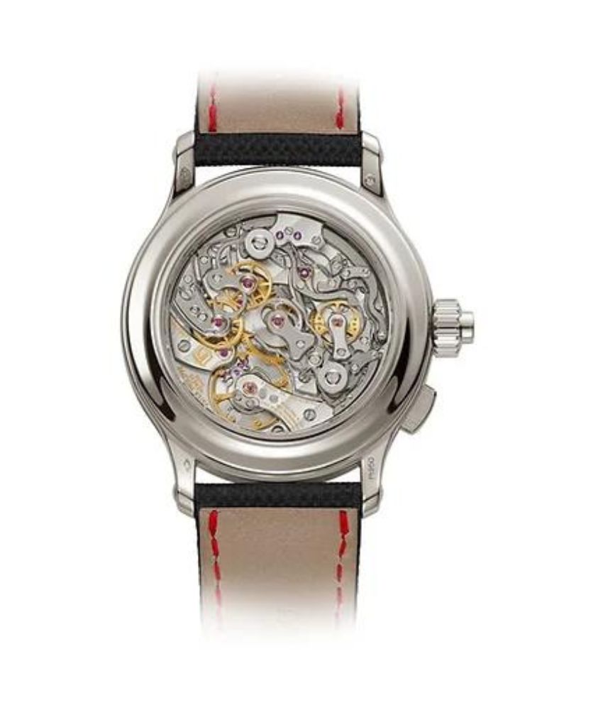 The watch is encased in a luxurious platinum case, delivering a sporty yet contemporary look. The charcoal-colored dial boasts a black gradation, complemented with red varnished chronograph hands. Its sophisticated look is echoed on the black calfskin strap, enhancing the watch’s overall aesthetic appeal. This watch is not only an instrument of time but a statement piece that exudes style and elegance.