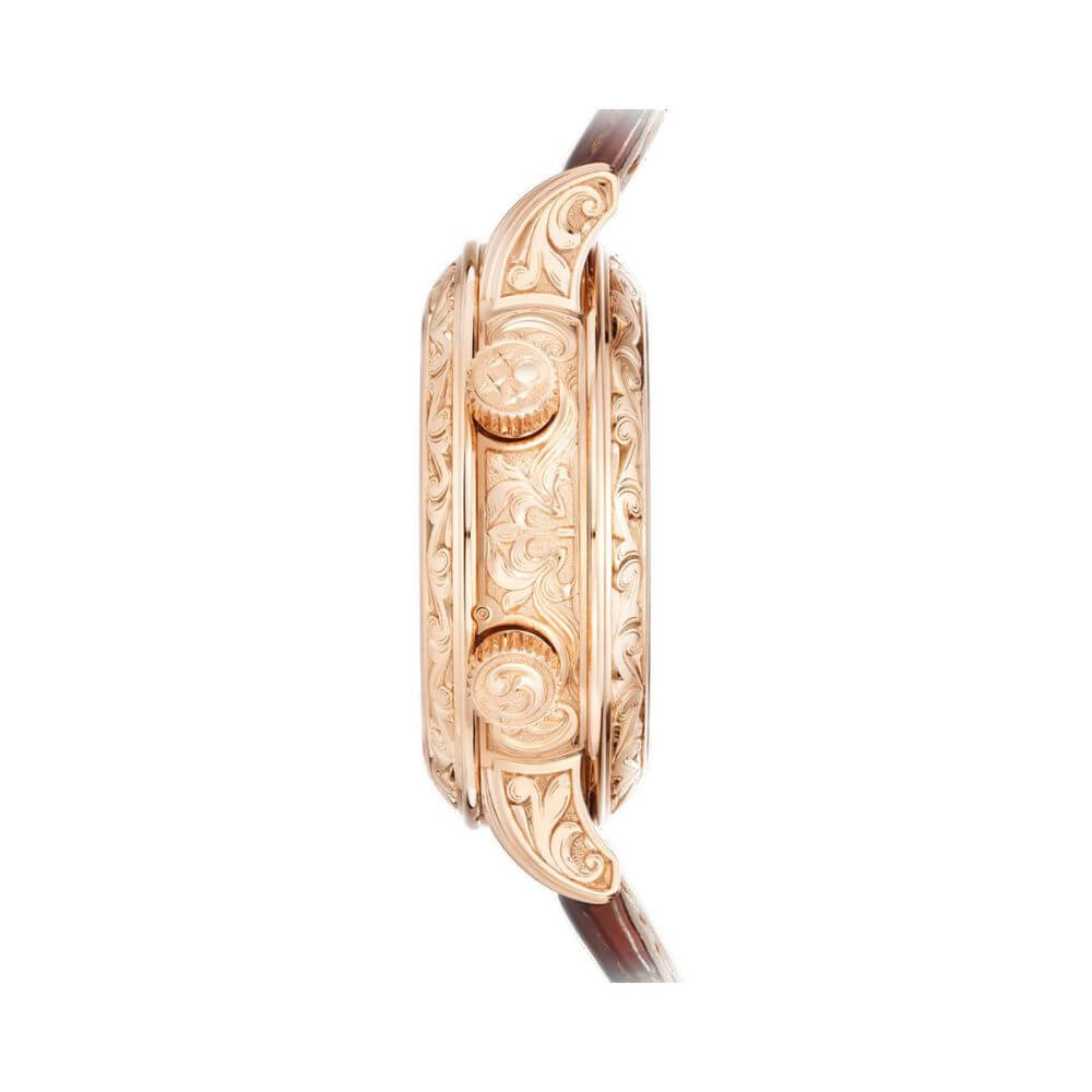 Every detail of the Patek Philippe 6002R-001 exudes luxury. The double-faced case, crowns, slide piece, hour/minute hands, and fold-over clasp are meticulously hand engraved with intricate volutes and arabesques, showcasing the brand’s dedication to exceptional craftsmanship. The front dial is a visual delight, combining the centuries-old techniques of Grand Feu champlevé enameling and cloisonné to create a rich and captivating display.