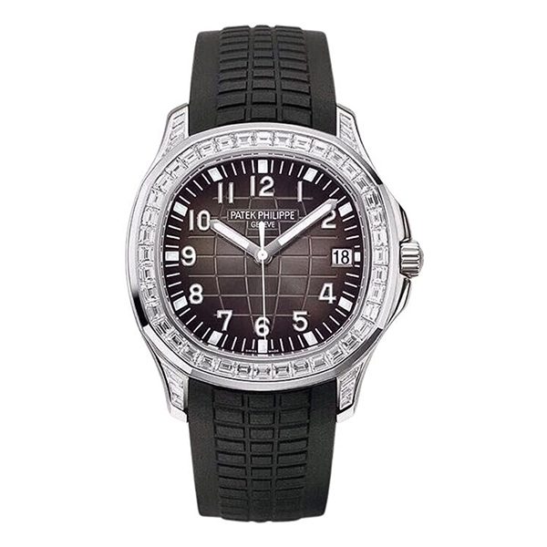 The grenade-like raised guilloché pattern at the center of the dial, the bold Arabic numerals, and legible hands, and of course its tropical rubber strap are all present and accounted for. Even with the dazzling diamonds, the classic Aquanaut case shape is still recognizable from across the room. Despite the precious metal and diamonds, the watch still retains its sportiness with its durable rubber strap and 120m water-resistant case.