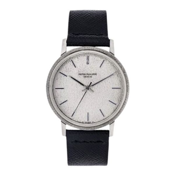 Patek Philippe introduced the reference 3569 in 1969 and it was produced until circa 1986. This was the first back-wind wristwatch by the firm. This model was made in many variations and the present example has a textured dial with matching textured bezel giving this watch an interesting and chic style.