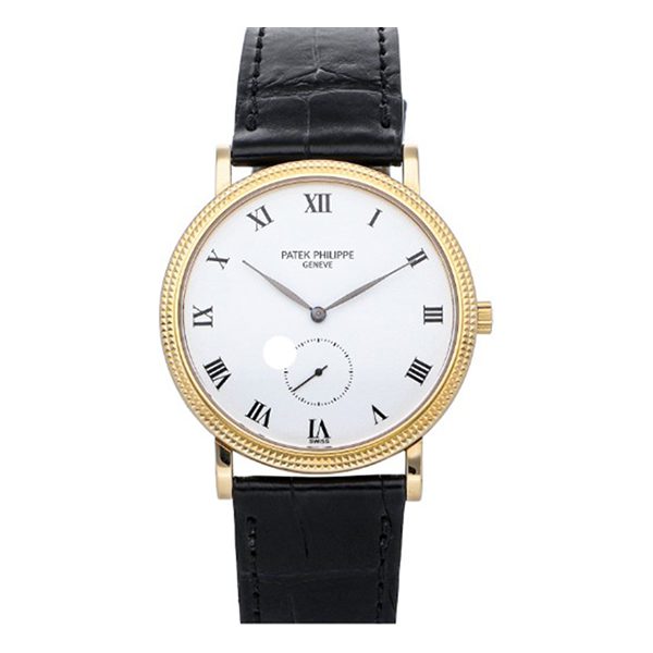 The Patek Philippe Calatrava 3919 is a manual wind watch, features a 33.5mm case diameter, with 18 karat yellow gold case surrounding a white dial and roman numerals on a black strap with an 18 karat yellow gold tang buckle. Functions of this watch includes hours, minutes and small seconds.
