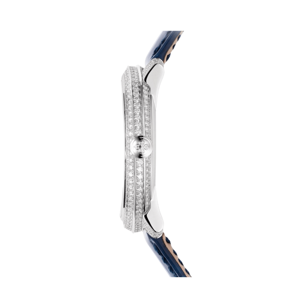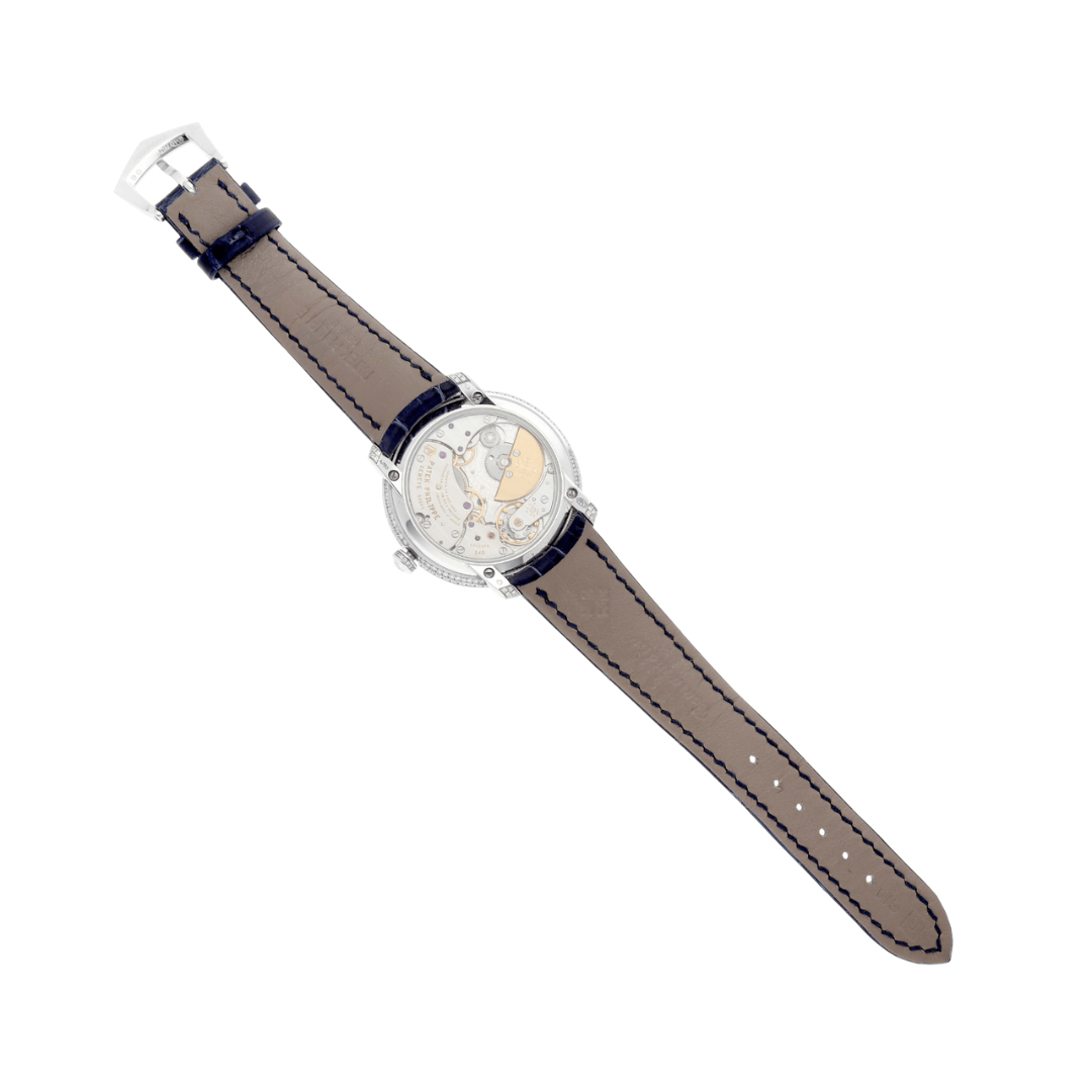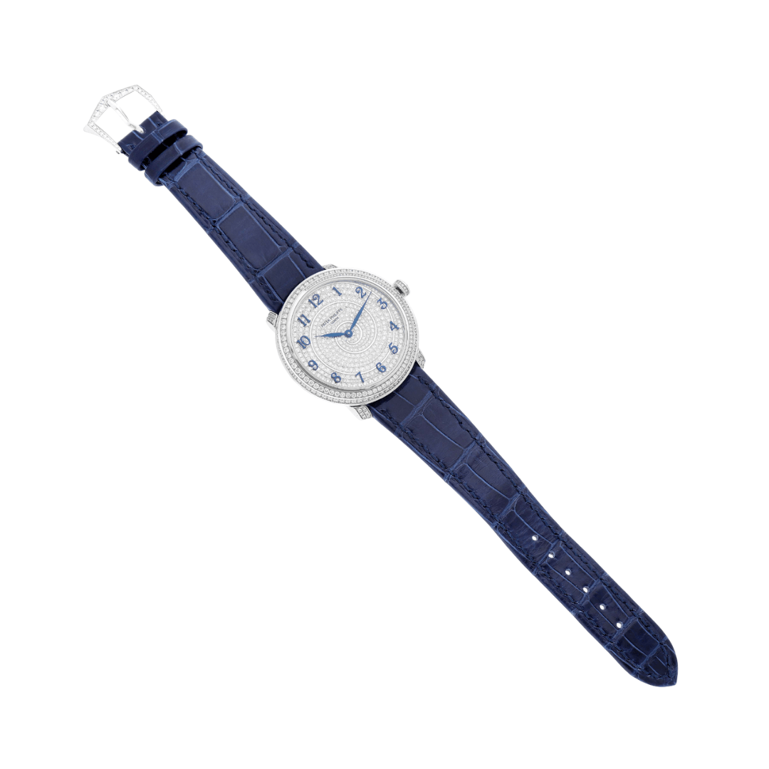 Beneath this luminous aesthetic, it beats a super-slim, self-winding 240 caliber, allowing the watch to retain a fine and elegant profile. Fully set with diamonds, blue-gold applied figures 18 kt gold dial plate. White gold. Diameter: 36.5 mm. Height: 8.23 mm. Waterproof up to 30 m. Sapphire crystal back. Case Shiny leather with square scales, hand-stitched, brilliant twilight blue.