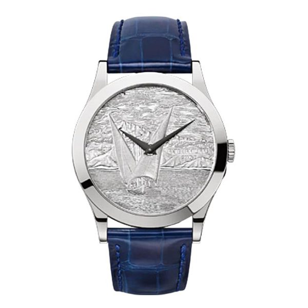 The Calatrava 5089G-015 showcases a round case with a diameter of 38.6mm, crafted from high-quality 18k white gold. Its bezel is fixed and also made from the same elegant material, adding to the watch’s overall allure. The silver-tone dial is adorned with dauphine-style hands, providing a classic and sophisticated look. What sets this timepiece apart is the intricate hand-engraved design on the dial, depicting beautiful scenes of Geneva harbor and the graceful Lake Geneva barques.