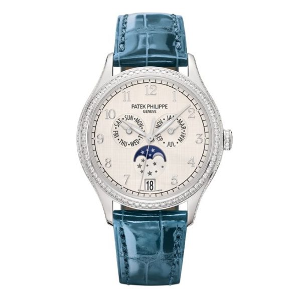 Patek Philippe Complications 4947G-010 stunning timepiece is crafted in elegant white gold, featuring a round case shape that embodies timeless beauty. The bezel sparkles with exquisite diamonds, adding a touch of glamour. The sapphire crystal protects the dial from scratches, ensuring clarity for years to come.