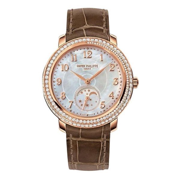 Patek Philippe Complications 4968R-001 Mother of Pearl Dial Diamond-Set Spiral 33.3mm 18k Rose Gold Brown Leather Ladies Watch