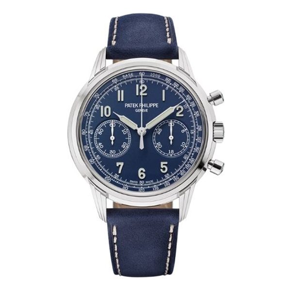 The watch face is a special blue color, with bright white gold numbers that glow in the dark. This makes it easy to see the time, no matter how light or dark it is. The white gold edge around the watch face, or bezel, is smooth and fixed in place, adding to the watch’s high-end feel.