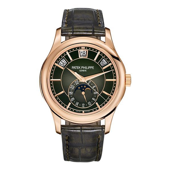 The watch shines with an amazing design that includes a curved bezel, cut-out lugs, and carved sides. All these features have been polished by hand by expert craftsmen from Patek Philippe. The case and bezel, made from 18 karat rose gold, match perfectly with the olive green dial. The dial, adorned by a sunburst pattern and a black ring around the edge, adds a sophisticated touch.