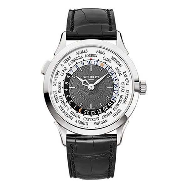 Patek Philippe Complications 5230g-001 18kt white gold case with a black leather strap. Fixed 18kt white gold bezel. Charcoal gray dial with silver-tone hands and index hour markers. 24 hour (day / night) markers. world time cities around the outer rim. Dial Type: Analog. Patek Philippe Calibre 240 HU Automatic movement, based upon Patek Philippe 240, containing 33 Jewels, composed of 239 parts, biting at 21600 vph, and has a power reserve of approximately 48 hours. Scratch resistant sapphire crystal. Transparent case back. Round case shape. Case size: 38.5 mm. Fold over clasp. Water resistant at 30 meters / 100 feet. Functions: world time, GMT, second time zone, hour, minute, day/night indicator. Travel watch style. Watch label: Swiss Made. Patek Philippe Complications 18kt White Gold World Time Automatic Men’s Watch 5230G-001.