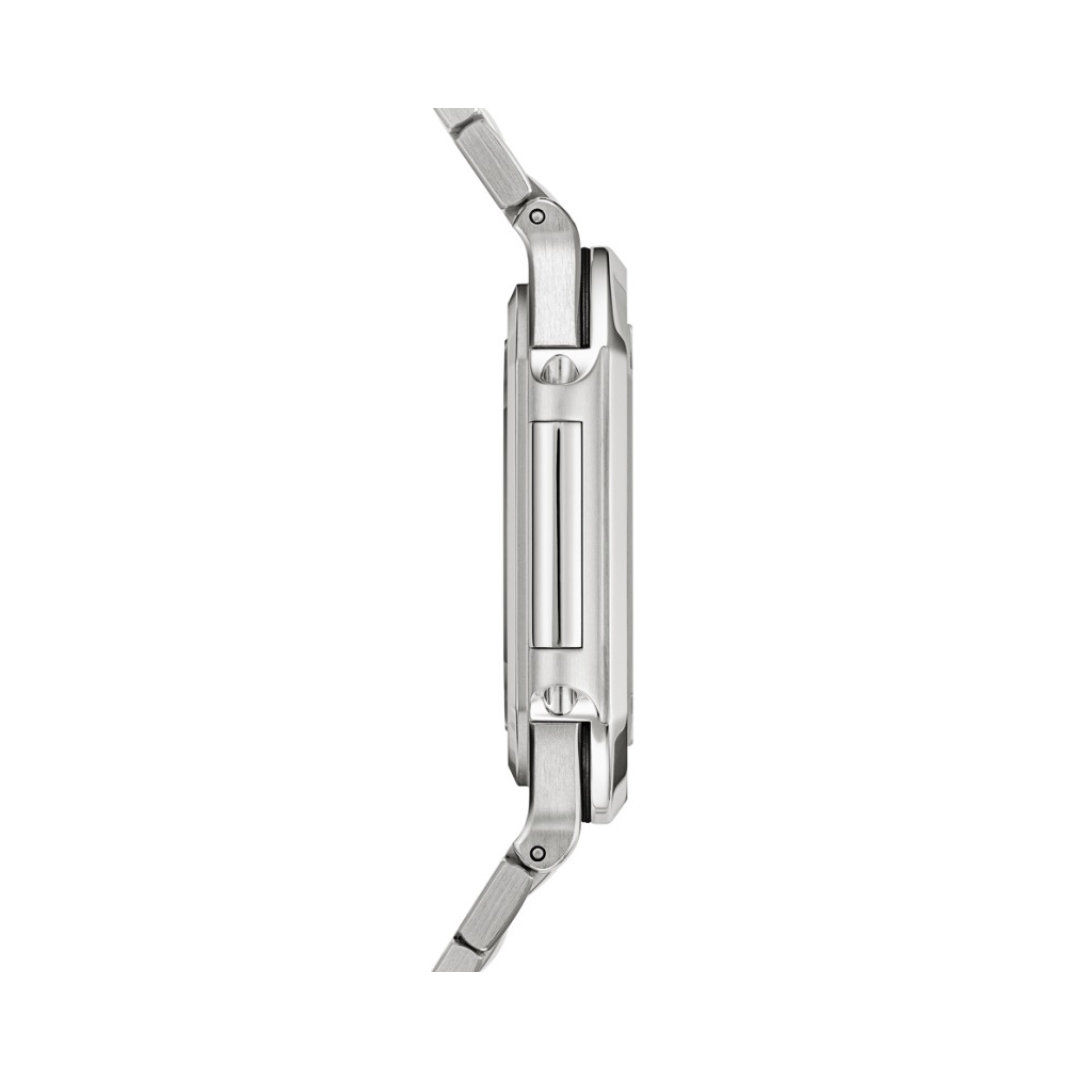 This square-shaped steel case with rounded edges has a slim, comfortable fit. The alternating polished and satin-brushed finishes give the watch an elegant yet relaxed appearance, perfect for modern style. Measuring 45 mm in diameter and 8.3 mm in thickness, the case is durable and water-resistant up to 30 meters, making it suitable for both formal and casual settings.