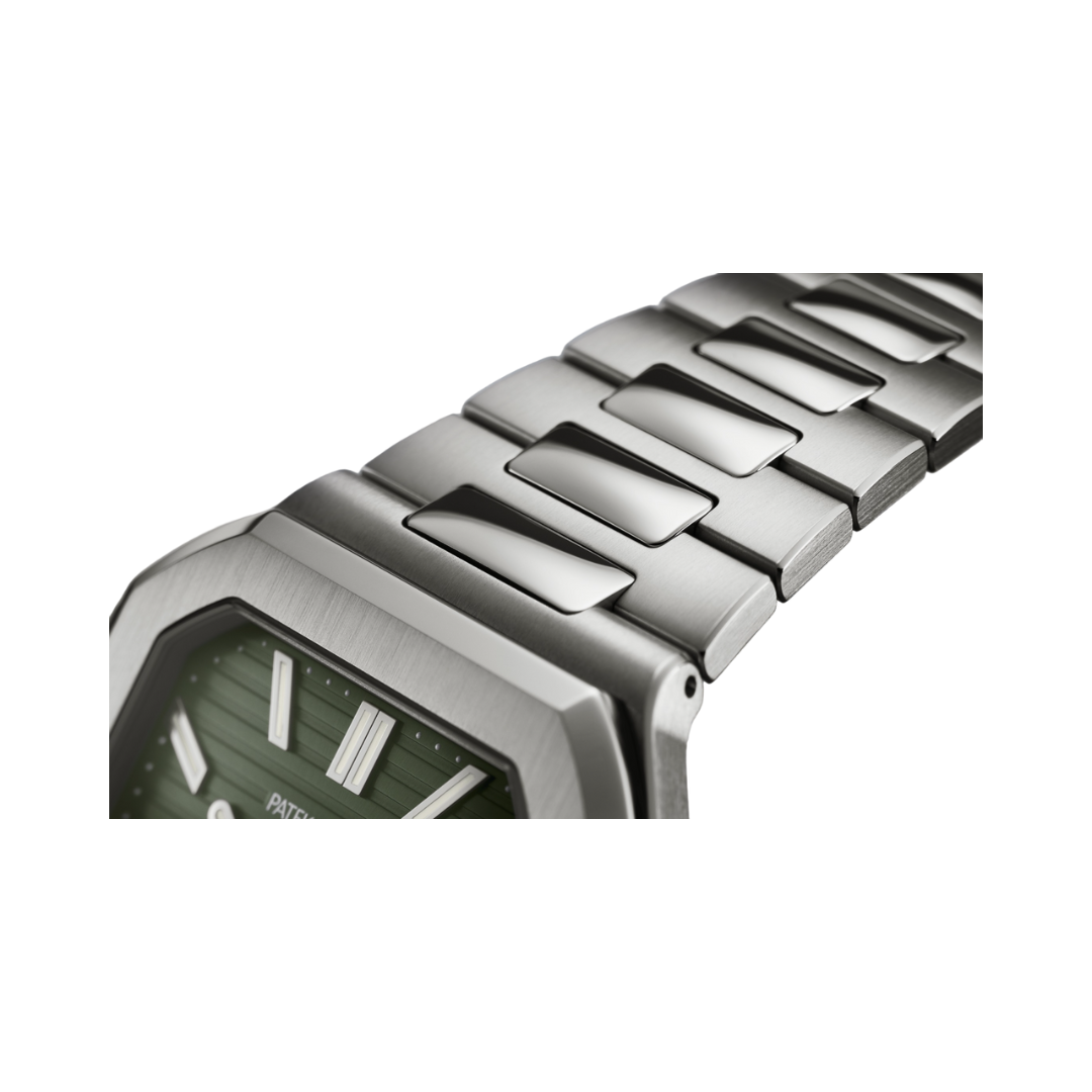 The sunburst olive green dial of the Cubitus 5821/1A stands out with its unique horizontal embossing, adding depth and a refined look. The dial features white gold hour markers coated with a luminescent material, enhancing visibility in low light. This beautiful green color adds a contemporary feel while remaining timeless.