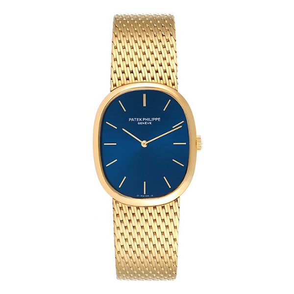 The Patek Philippe Golden Ellipse 3605/1J features an oblong shaped 38mm case in 18 Carat Yellow Gold with a midnight blue dial and matching 18 Carat Yellow Gold Milanese Style Bracelet. The watch features a date window complication, and is powered by an automatic movement.