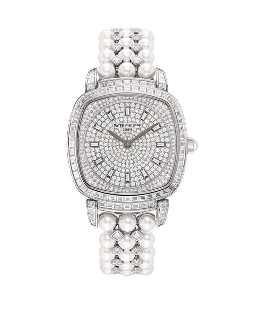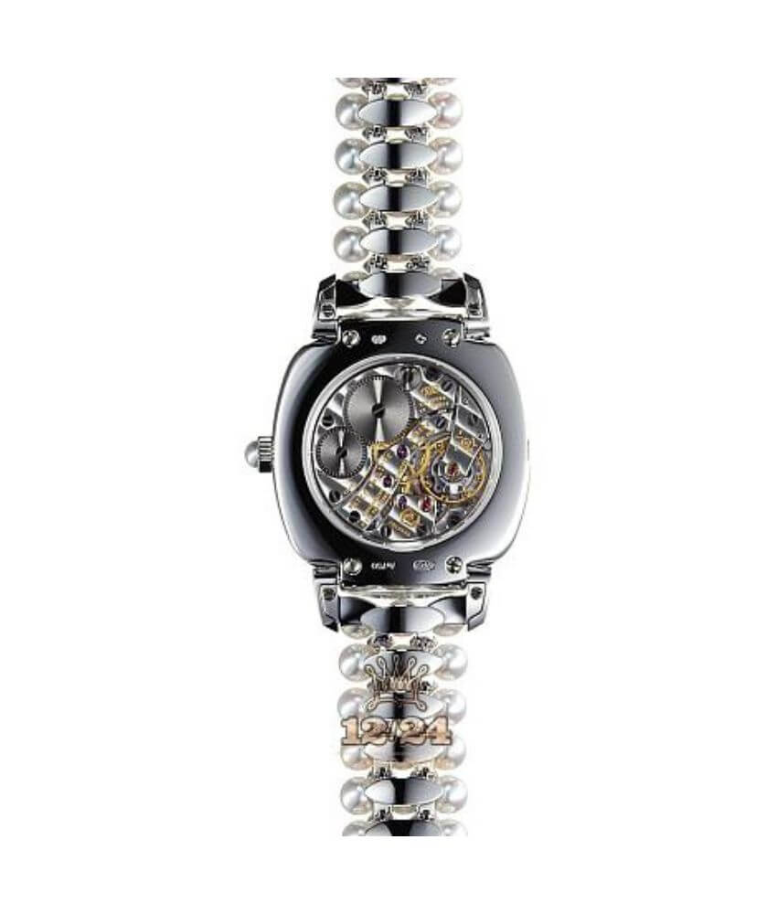 The watch’s crown is decorated with a smooth Akoya pearl, bringing an elegant and sophisticated touch. The bracelet of the watch is embellished with 78 Akoya pearls, weighing around 48.85 carats, and the white gold links have 48 princess-cut diamonds, weighing about 2.28 carats. The fold-over clasp is adorned with 55 diamonds, weighing approximately 0.23 carats, giving the watch a breathtaking appearance.