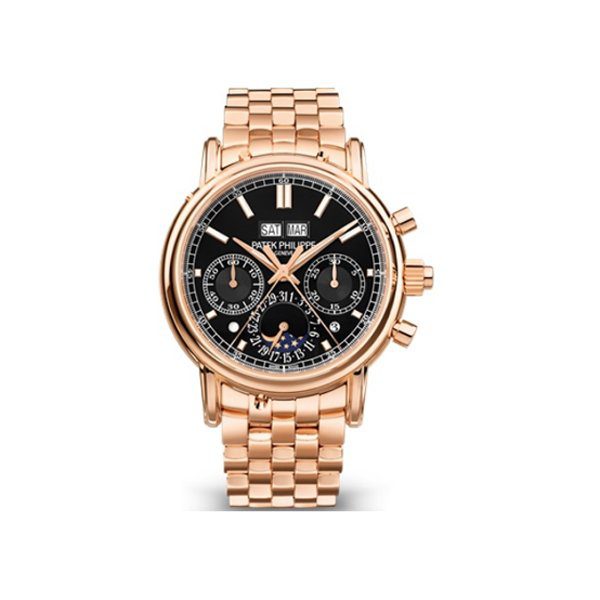 Patek Philippe Grand Complications 5204/1R-001 Split-Seconds Chronograph Perpetual Calendar manual-wind watch, features a 40.2mm 18k rose gold case surrounding a black dial on an 18k rose gold bracelet with folding buckle. Functions include hours, minutes, small-seconds, day, date, month, moon phase, leap year indicator, split second chronograph and perpetual calendar. This watch comes complete with box and papers.