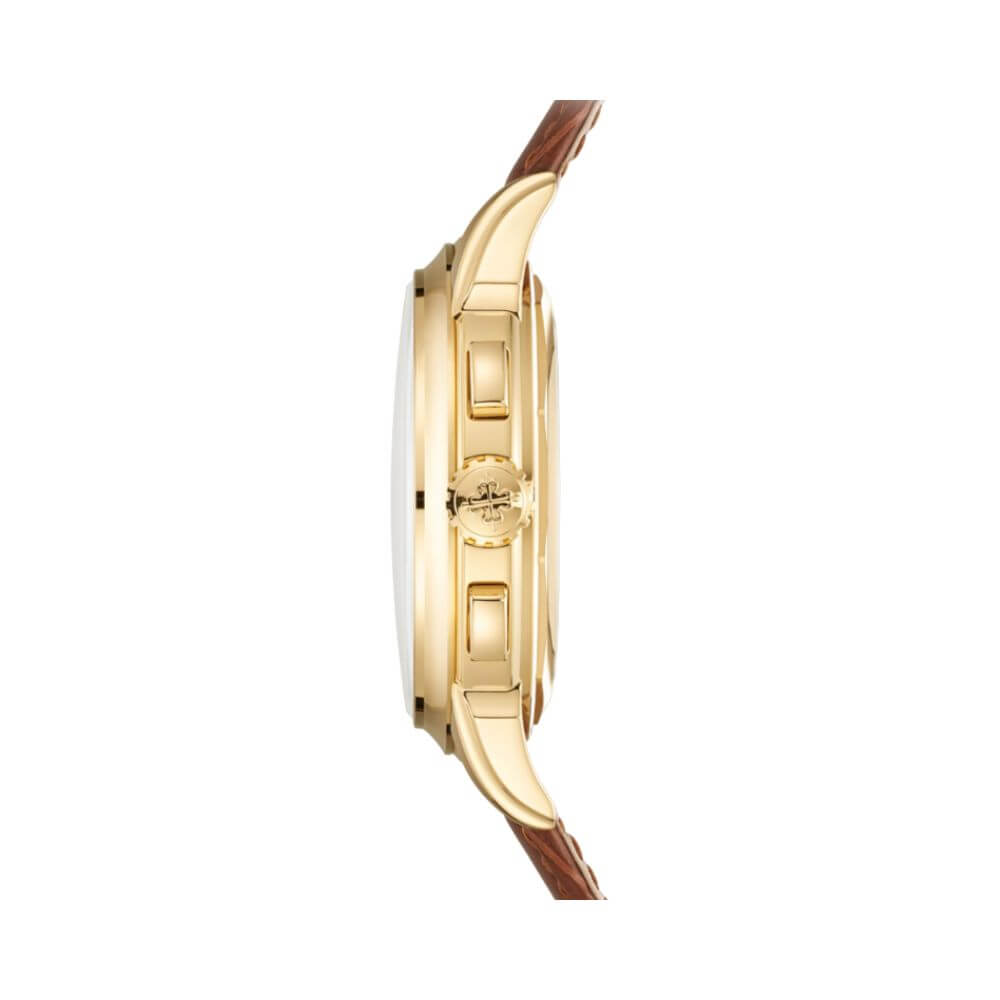 The watch’s face is a shimmering white, embellished with 12 markers, hour and minute hands, and a balanced stopwatch hand, all in 18K yellow gold. These golden details stand out against the white backdrop, improving visibility and adding a touch of luxury. A hand-stitched matte chocolate brown alligator leather strap with large square patterns rounds out the watch’s sophisticated look. An 18K yellow gold fold-over clasp ensures a snug and secures fit.