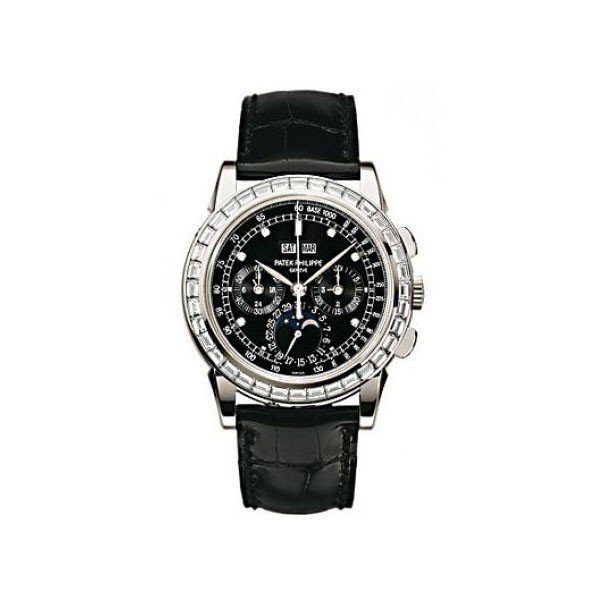 Water resistant at 30 meters / 100 feet. Functions: perpetual calendar, chronograph, column wheel, leap year, month, date, day, hour, minute, small second, day/night indicator. Additional Info: bezel is set with 36 baguette diamonds (3.88 ct.). Luxury watch style. Patek Philippe Grand Complications 5971P-001 Mechanical Perpetual Chronograph Diamond Black Dial Men’s Watch.