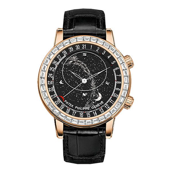 Honoring Patek Philippe’s expertise in astronomical watches, the Grand Complications Celestial 6104R-001 presents a mesmerizing dial dedicated to the celestial bodies. This intricate dial rotates to display an accurate representation of the night sky in the northern hemisphere. It showcases the apparent movement of stars, the moon’s phases and orbit, and even indicates the time of meridian passage for Sirius and the moon. The dial also features two skeletonized hands indicating mean solar time.