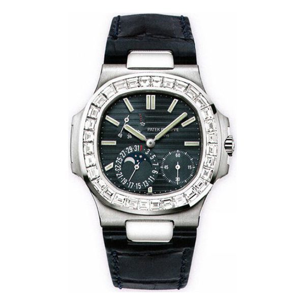 Patek Philippe Nautilus 5722G-001 Black-Blue Index Dial Baguette Diamond Bezel 40Mm 18K White Gold Navy Blue Leather Straps Men’S Watch