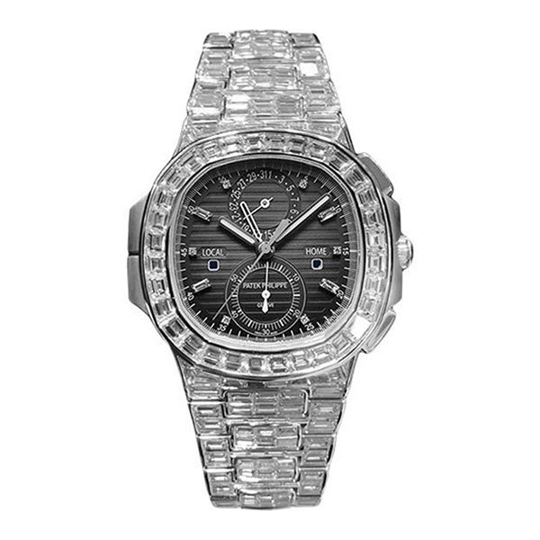 The Patek Philippe Nautilus 5990/1400G-001 Travel Time Chronograph  features 40.5 mm 18K white gold case set with diamonds, sapphire-crystal back, black gradated dial with diamond hour markers, caliber CH 28-520 C FUS self-winding movement Nautilus Travel Time Chronograph (chronograph with 60-minute counter, dual time zone mechanism indicating local and home time, local and home day/night indication in apertures, local date by hand, sweep seconds chronograph hand), minimum 45 hours, and maximum 55 hours of power reserve, 18K white gold bracelet set with diamonds, butterfly buckle. Water resistant to 120 meter.