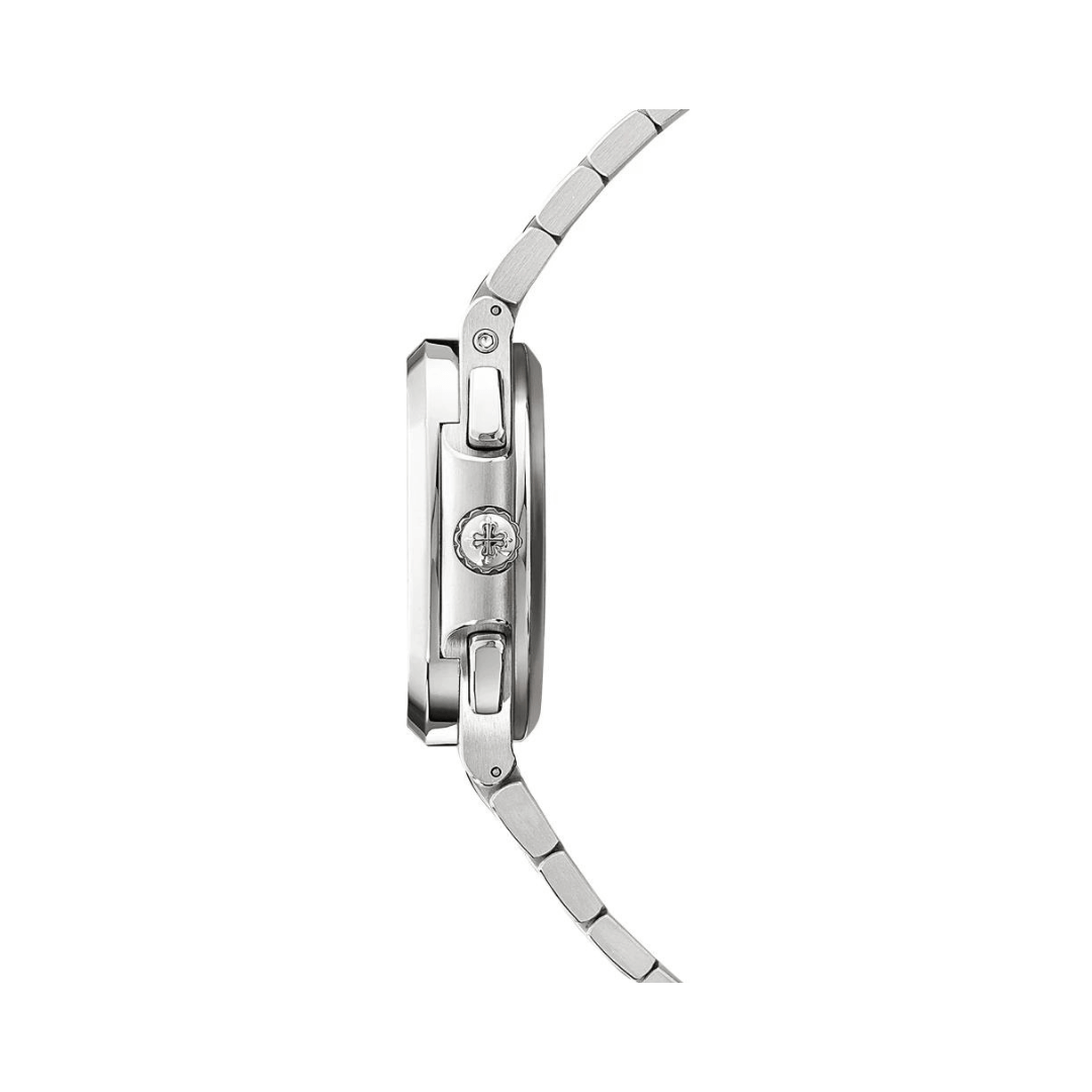 The Nautilus 5990/1A-011 features a stainless steel case with a diameter of 40.5mm and a case height of 12.53mm. The cushion-shaped case is visually appealing and water-resistant up to 120 meters. Crafted from stainless steel, the bracelet is equipped with a Nautilus folding clasp for a secure and comfortable fit.