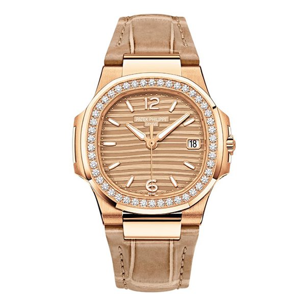 Patek Philippe Nautilus 7010R-012 Golden Index Dial Diamond-Set Bezel 32Mm 18K Rose Gold Beige Leather Straps