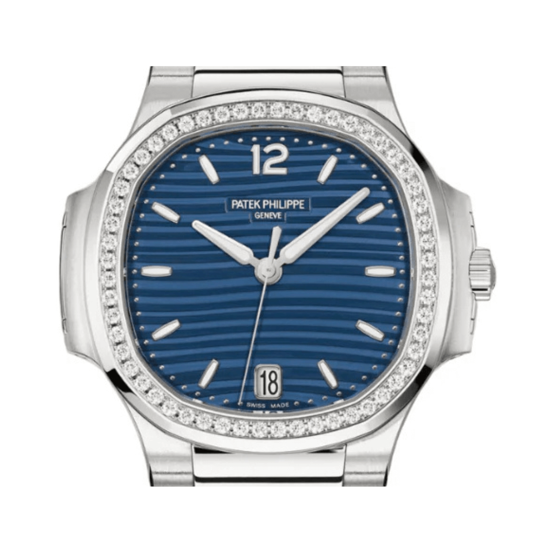 Discover the exquisite beauty of the Patek Philippe Nautilus 7118/1200A-001 Blue Opaline Index Dial Diamond-Set Bezel Ladies Watch. This beautiful watch has a slightly bigger size of 35.2mm, making it stand out on your wrist. The case is crafted from strong stainless steel, ensuring it lasts long and looks stylish.