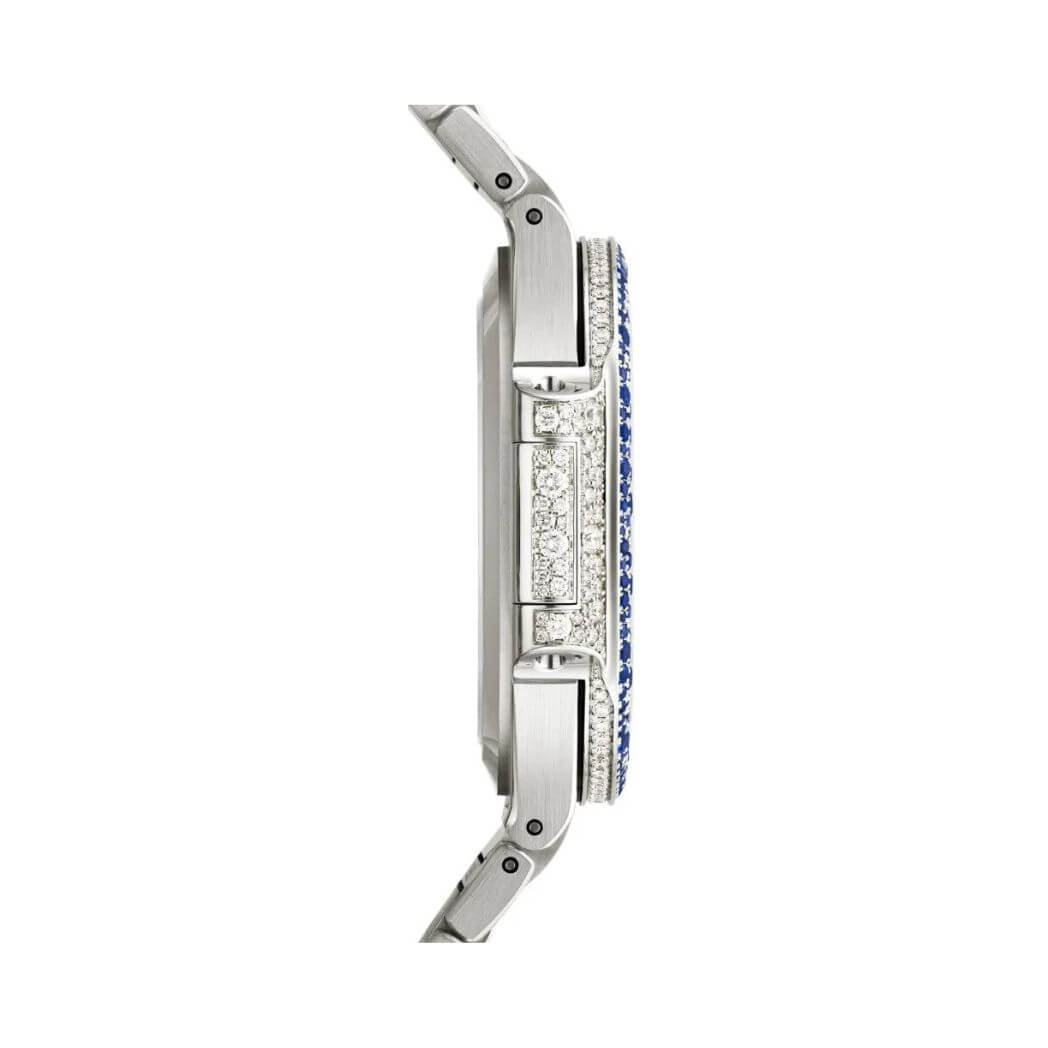 The watch features an exquisite 18kt white gold case and bracelet, both paved with diamonds and sapphires. The fixed bezel continues the opulence, creating a radiant ensemble that catches the eye. The octagonal case shape adds a touch of uniqueness, with a diameter of 35.2mm and a slim thickness of 8.65mm.