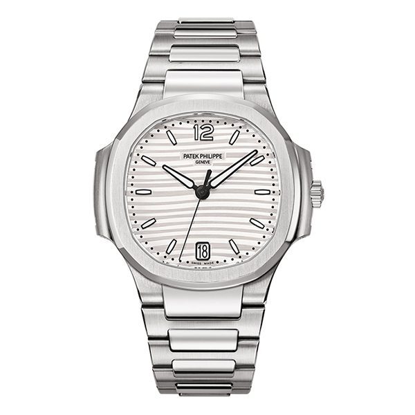 The Nautilus Automatic Ladies Watch features a 35.2mm stainless steel case with a slim profile of only 8.62mm. Its scratch-resistant sapphire crystal ensures long-lasting clarity, protecting the beautiful silvery opaline dial underneath. The dial showcases luminous gold applied hour markers and numerals, allowing for easy reading in any light condition.