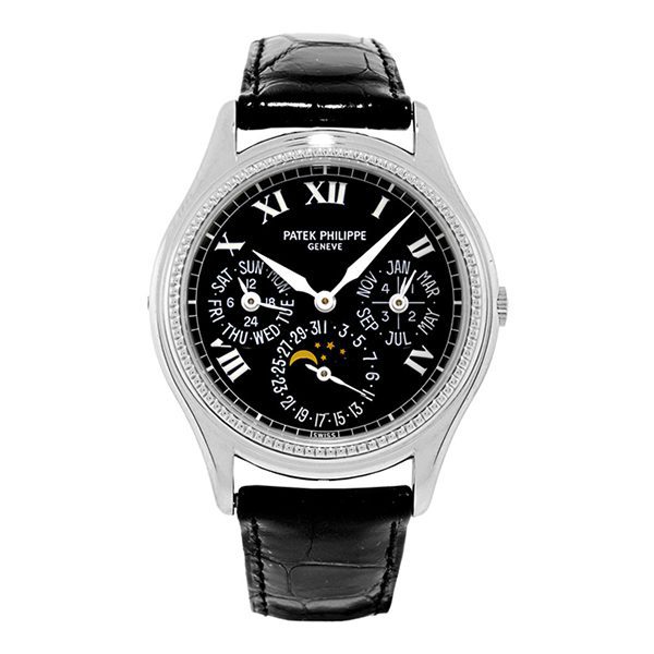Patek Philippe Perpetual Calendar wristwatch 5038G, featuring the caliber 240 Q mechanical automatic movement (Geneva seal hallmarked, Gyromax balance, 27 jewels, 22k gold mini-rotor); black dial with white Roman numerals, outer minute track and white hands; perpetual calendar complication including subsidiary dials for the month with leap year at 3 o’clock, date with moon phase aperture at 6 o’clock and day with 24-hour indication at 9 o’clock; sapphire-crystal, exhibition case back; and 36mm, 18k white gold case with a beaded bezel on a black leather strap with a Calatrava-style, 18k white gold deployant clasp. Case, dial and movement signed Patek Philippe.