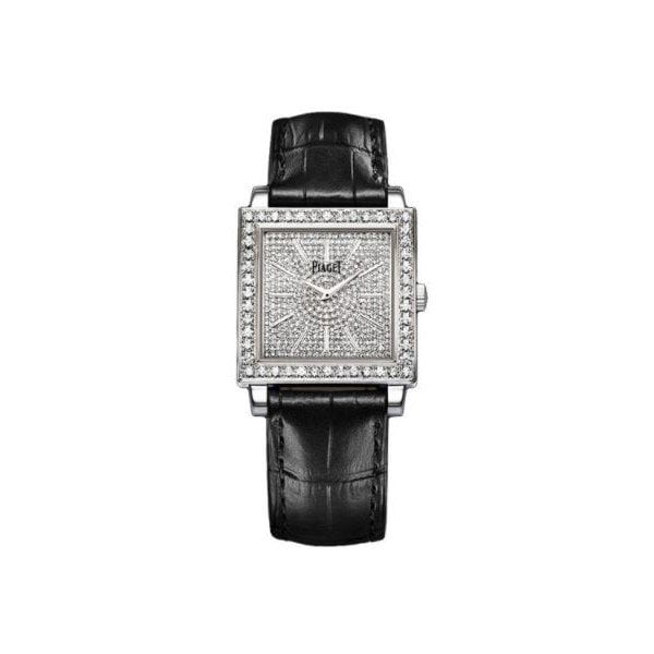 30 x 30 mm 18K white gold case set with 48 cut diamonds (approx. 1.5 ct), 6.1 mm thick, diamond bezel, gem set dial with 389 diamonds (approx. 1.2 ct) with 18K white gold hour markers, 430P manual movement, approximately 43 hours of power reserve, black leather strap, ardillon buckle set with 23 cut diamonds (approx. 0.05 ct). Water resistant to 03 ATM.