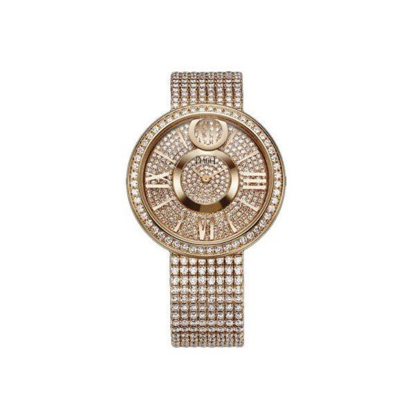 39 mm 18K rose gold case set with 52 brilliant-cut diamonds (approx. 1.6 ct), 7.9 mm thick, diamond bezel, gem set dial with 335 brilliant-cut diamonds (approx. 2.3 ct) with hour-markers in 18k rose gold, 56P quartz movement, 18K rose gold bracelet set with 522 brilliant-cut diamonds (approx. 16.3 ct), integrated buckle. Water resistant to 03 ATM.