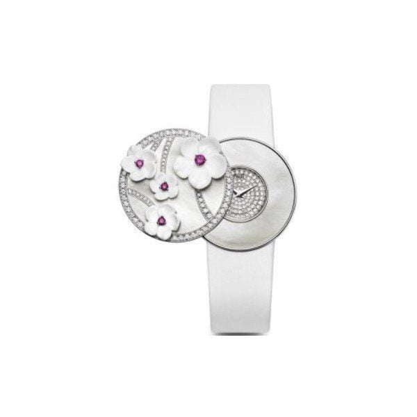 secret watch inspired by the decorative motif of cherry blossoms, 18kt white gold case, quartz movement, Ardiglione buckle, white satin strap, fixed bezel, mother of pearl dial embelished in the center by a pave of diamonds faceted dauphine hands.