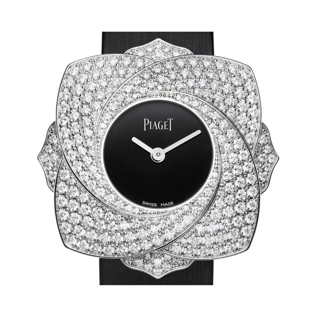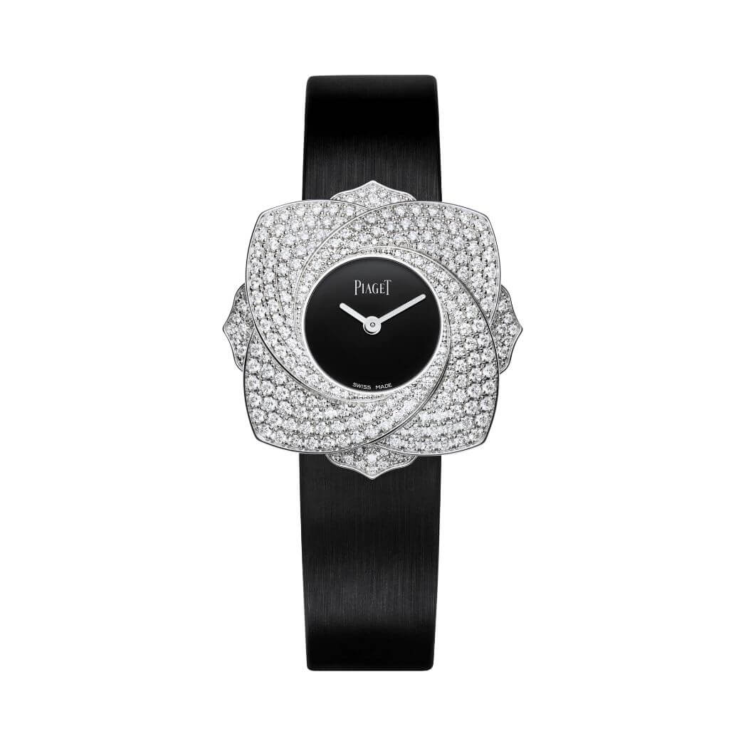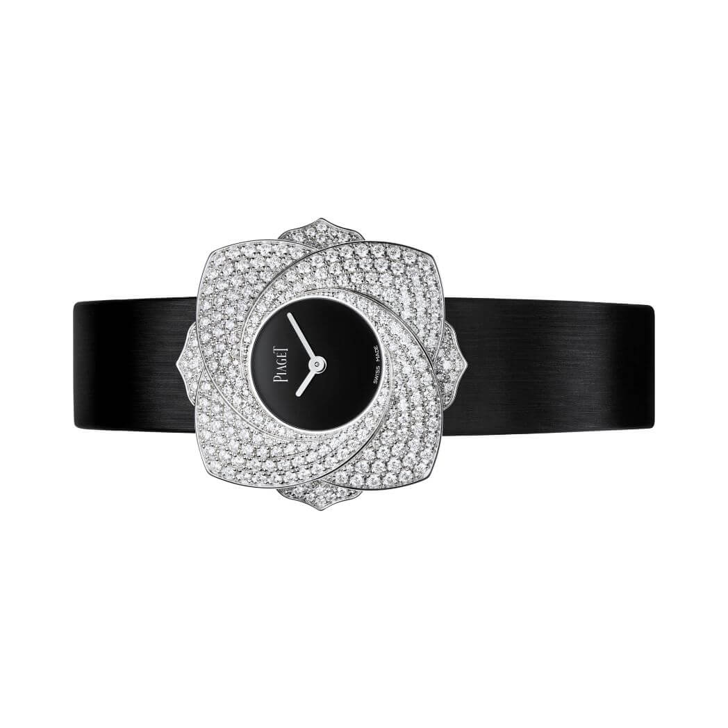 Even the buckle of the black satin strap is not overlooked, embellished with 13 brilliant-cut diamonds (around 0.1 ct). The black dial provides a striking contrast, enhancing readability while maintaining an air of sophistication.