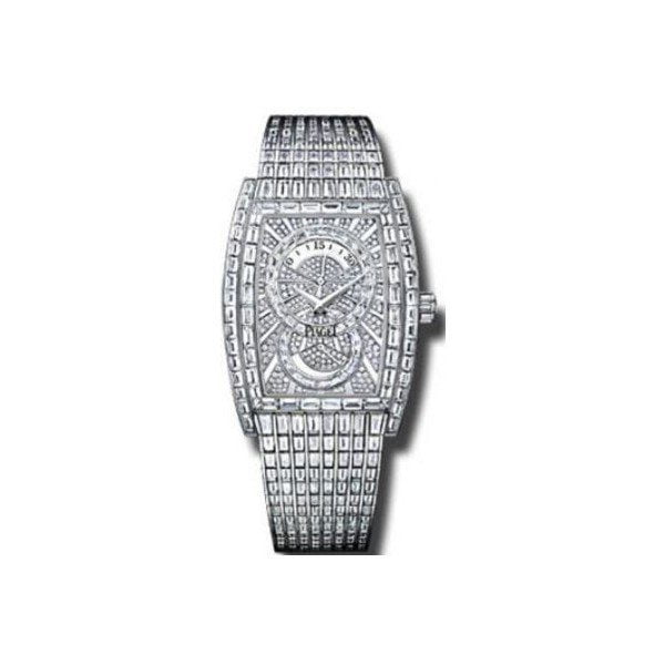 Piaget Limelight G0A31057  features 35 mm x 47 mm 18kt white gold case, 13.40 mm thickness, silver tone case, solid case back, tonneau case shape, silver tone bracelet, scratch resistant sapphire crystal, diamond dial, fixed bezel, automatic movement, hidden fold-over clasp, pull out crown, power reserve 42 hours, water resistant to 30 meters / 100 feet.