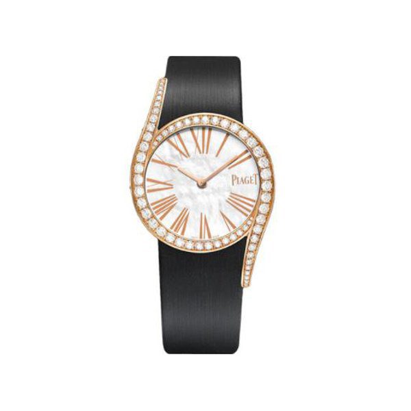 32 mm 18K rose gold case set with 62 brilliant-cut diamonds (approx. 1.75 ct), 7.4 mm thick, sapphire back, white dial with Roman numerals, 430P hand-wound mechanical movement with minutes, hours, approximately 43 hours of power reserve, black satin strap, ardillon buckle. Water resistant to 3 atm.