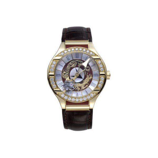18kt yellow gold case, manual winding movement, white dial, scratch resistant sapphire crystal, fold clasp, brown leather strap, water resistant to 30m/100ft.
