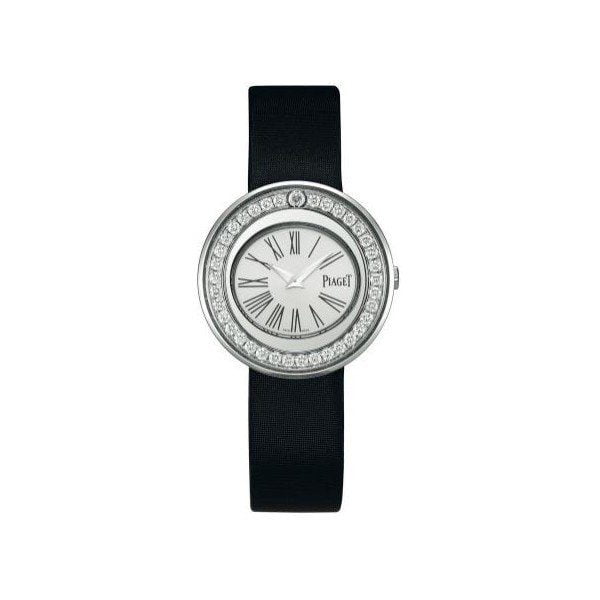 29 mm?18kt White Gold Rotating Upper Case, 6.2 mm thickness, solid case back, silver dial, scratch resistant sapphire crystal,?18kt White Gold set with 37 Diamonds bezel,? quartz movement, black satin strap, tang clasp, water resistant to 30m/100ft.