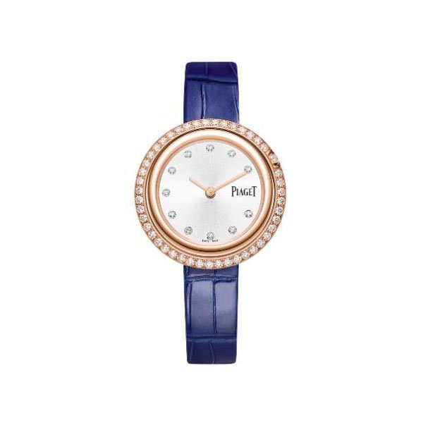 34mm 18k rose gold case, 7.47mm thickness, silvered gem-set dial, rotating bezel, quartz movement, blue leather strap, rose gold plated stainless steel ardillon buckle clasp, water resistant to 30m/100ft.