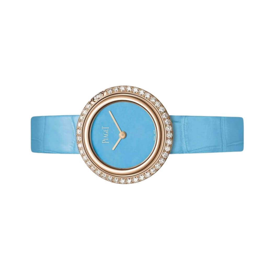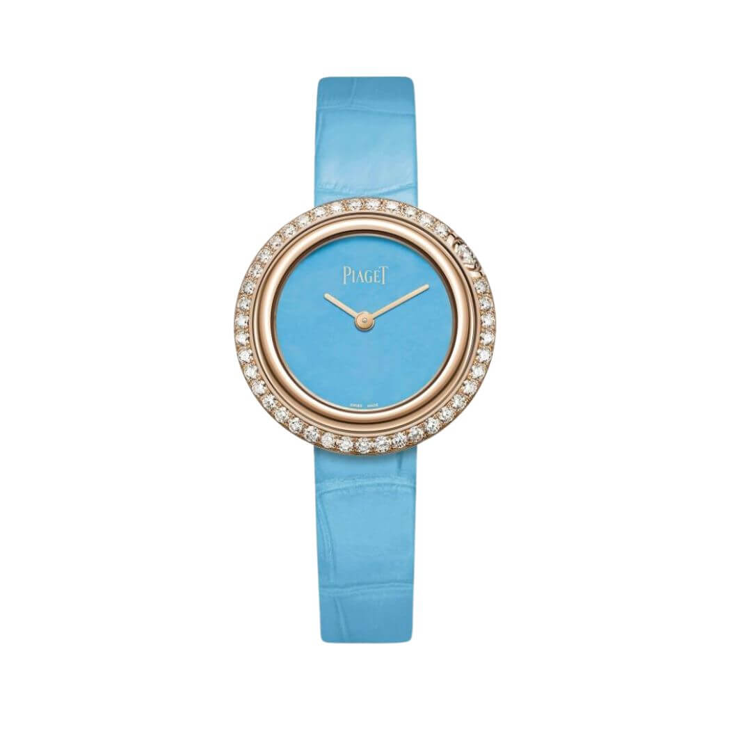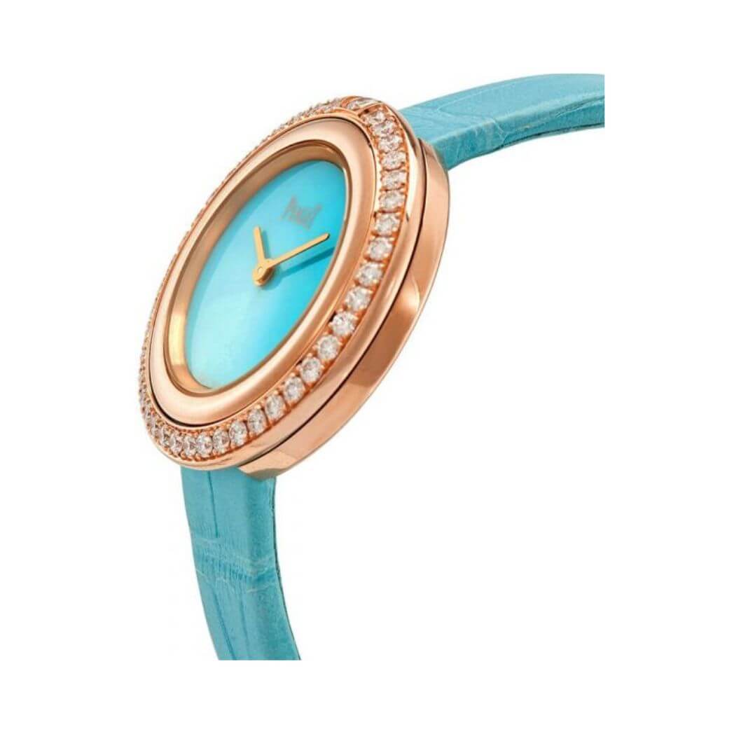 The 18K rose gold case, measuring 29mm in diameter, adds a touch of opulence. The stabilized turquoise dial exudes elegance, complemented by a stunning bezel set with 42 diamonds (~1.04 ct.). The alligator leather strap in a beautiful blue hue completes the luxurious aesthetic.
