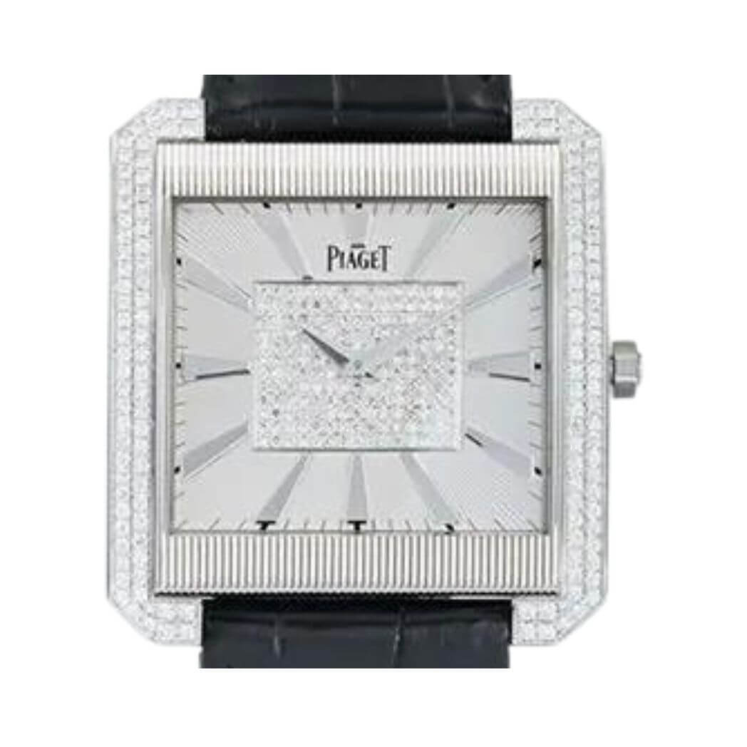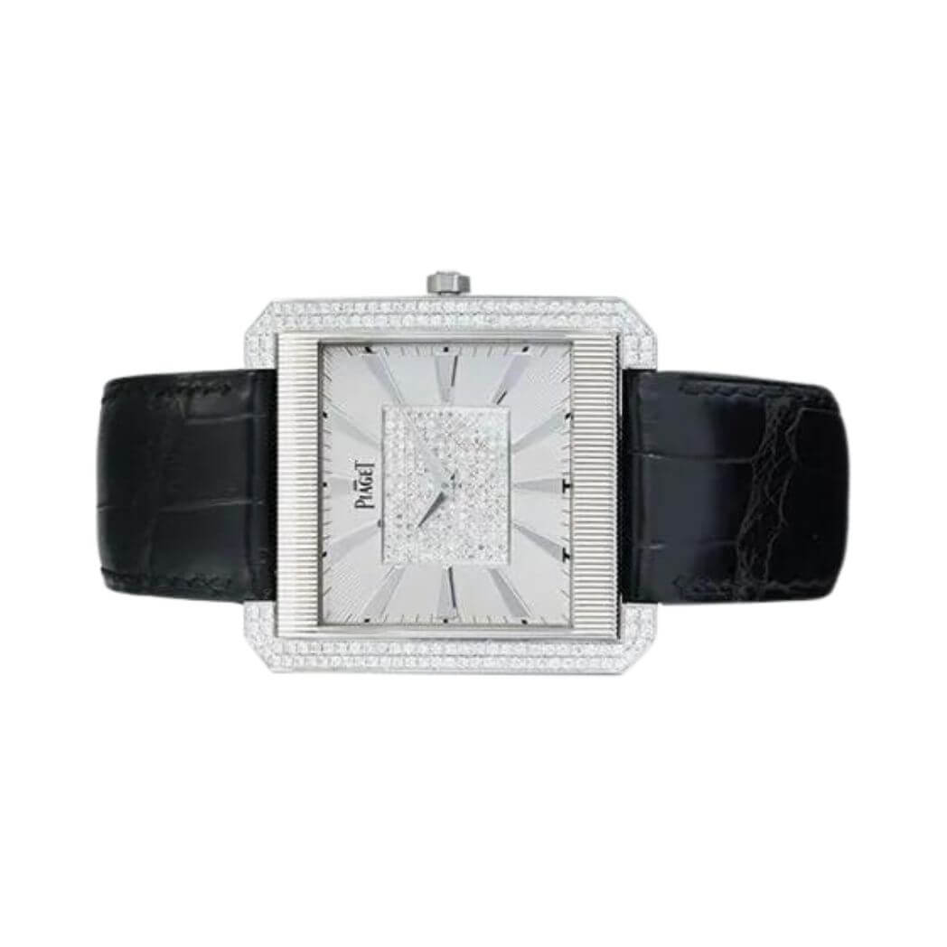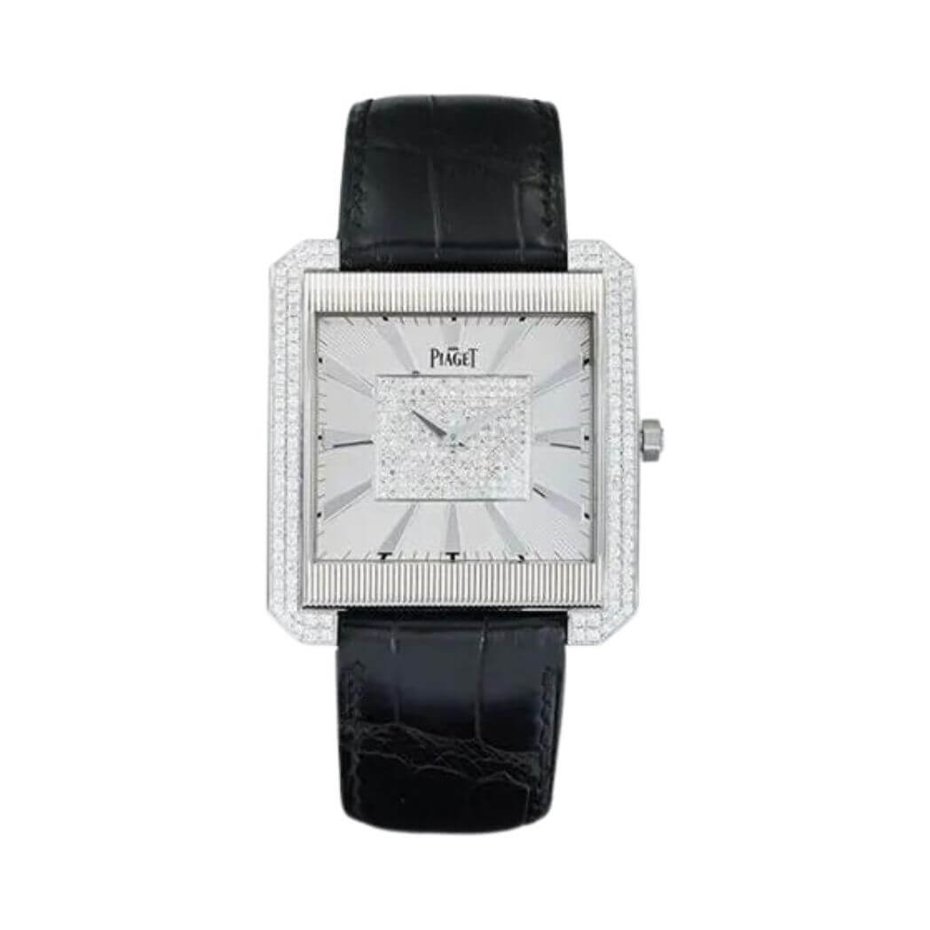 Fitted with a black leather strap and an 18k white gold Piaget folding clasp, this watch seamlessly marries style with comfort, ensuring a snug fit for any occasion.