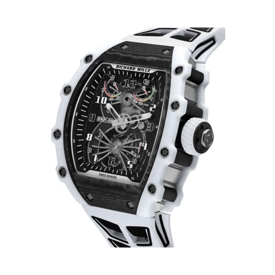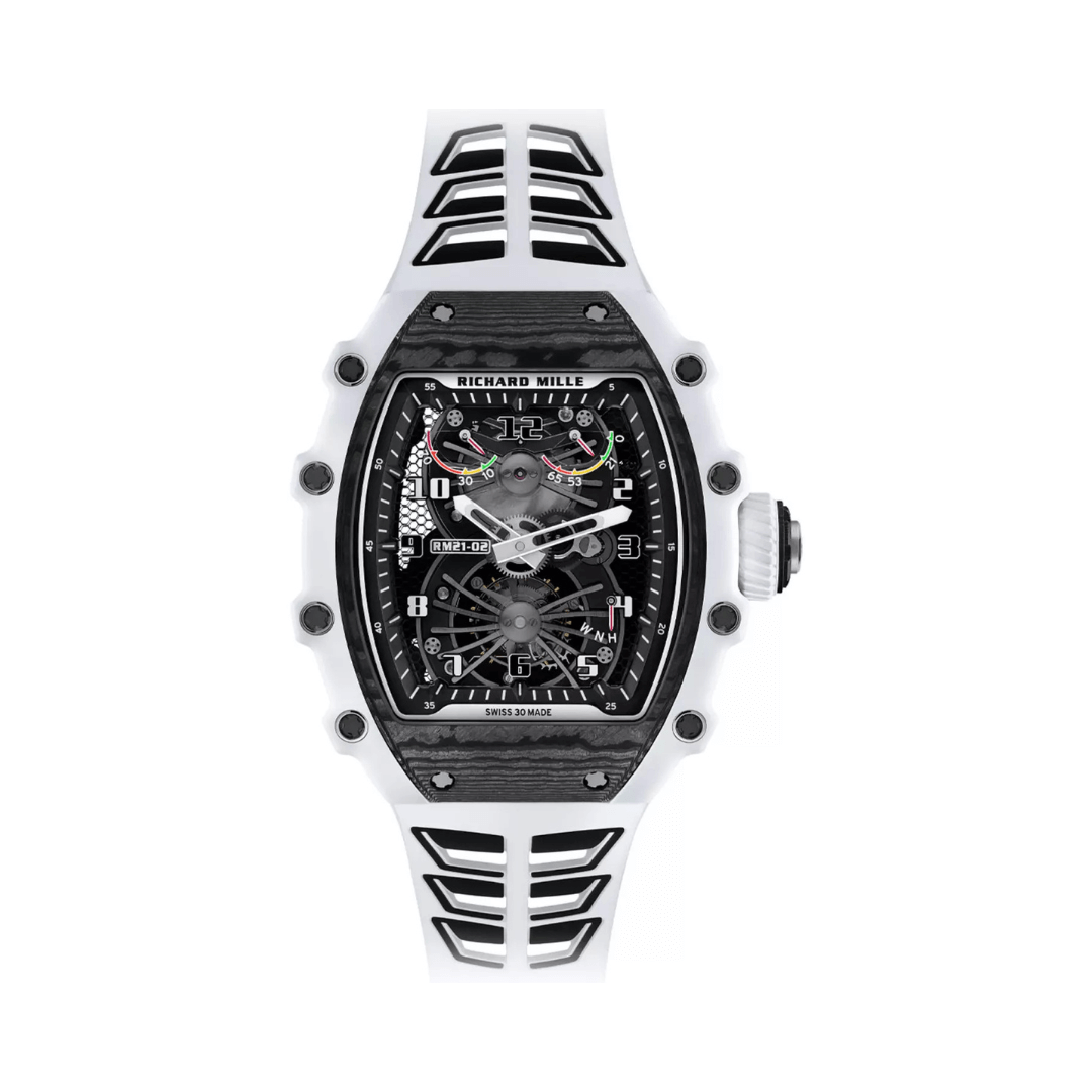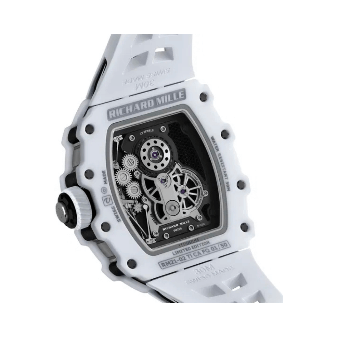The Richard Mille RM 21-02 White is a luxury men’s watch with an advanced manual-winding tourbillon movement. This timepiece is inspired by aerospace, aeronautics, and automotive engineering, ensuring exceptional precision and durability. It is a limited edition with only 50 pieces, making it a rare collector’s item.