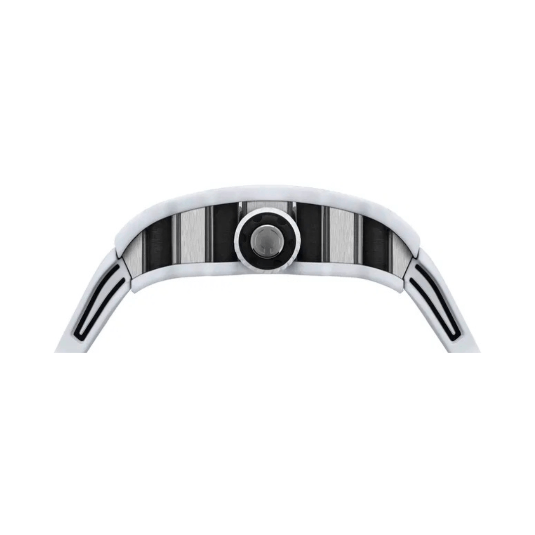 The white and black rubber strap ensures a secure fit and modern look, complementing the watch’s futuristic design.