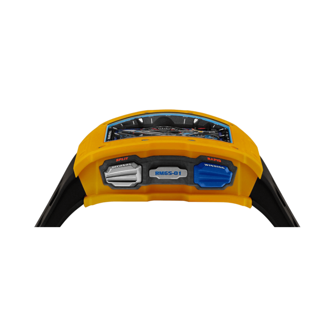 The Richard Mille RM 65-01 Automatic Split-Seconds is a luxury men’s watch that combines cutting-edge materials with high-end technology. This special timepiece comes in a Quartz TPT fiber case, giving it a unique, durable, and modern look. The case size is 44.5mm wide and 49.94mm long, with a thickness of 16.1mm, offering a bold presence on the wrist.