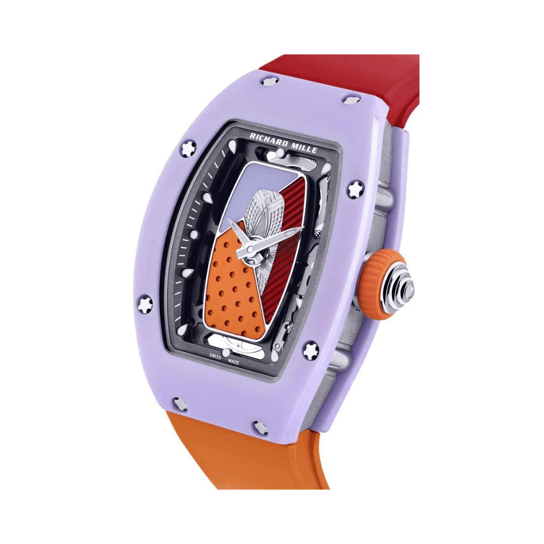The Richard Mille RM07-01 comes with a coral and tangerine rubber strap. This combination of colors adds a playful and stylish touch, perfect for summer.