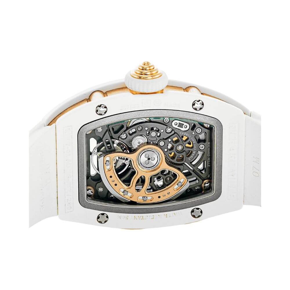 The Richard Mille RM07-01 RG-ATZ features a 31mm white ceramic and rose gold case, offering a perfect blend of durability and sophistication. The combination of these two materials creates a striking contrast that catches the eye. The case is not only visually appealing but also built to last, ensuring the longevity of your timepiece.