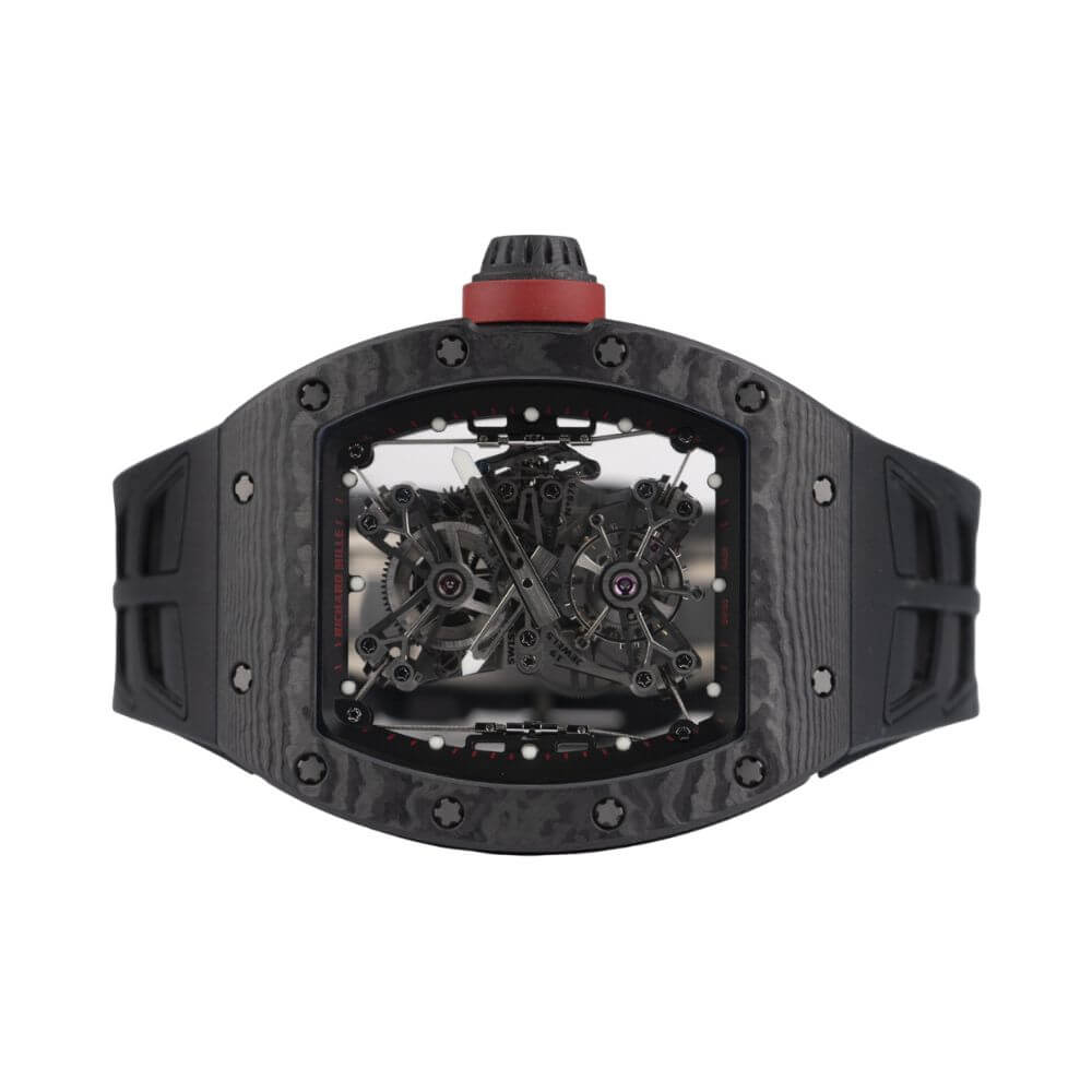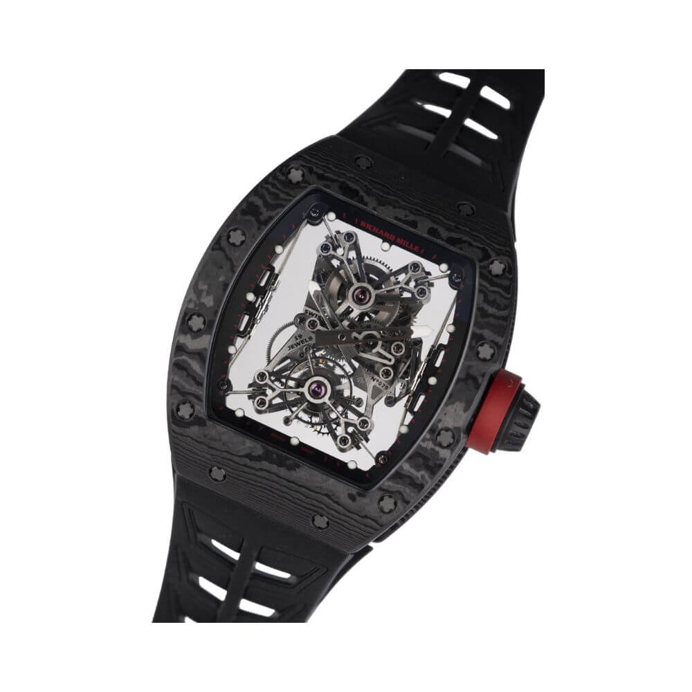 The dial is surrounded by a minute scale, carrying minimal branding, emphasizing the red and black color scheme. This attention to detail showcases Richard Mille’s commitment to creating a visually striking and technically advanced timepiece.